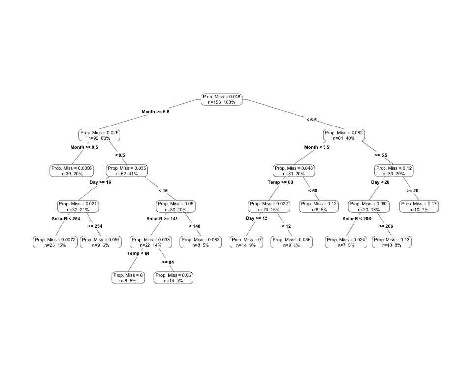 # vis_miss(messy_airquality)Here we can see that this produces quite a complex tree - this can be pruned back and the depth of the decision tree controlled.