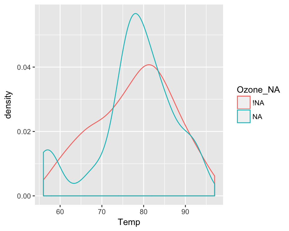 Below, we can plot the distribution of Temperature, plotting for values of temperature when Ozone is missing, and when it is not missing.