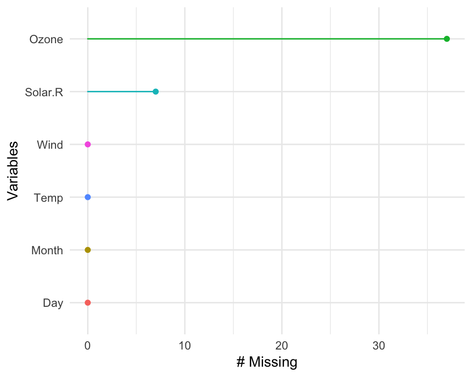 miss_var_summary(airquality)## # A tibble: 6 x 3