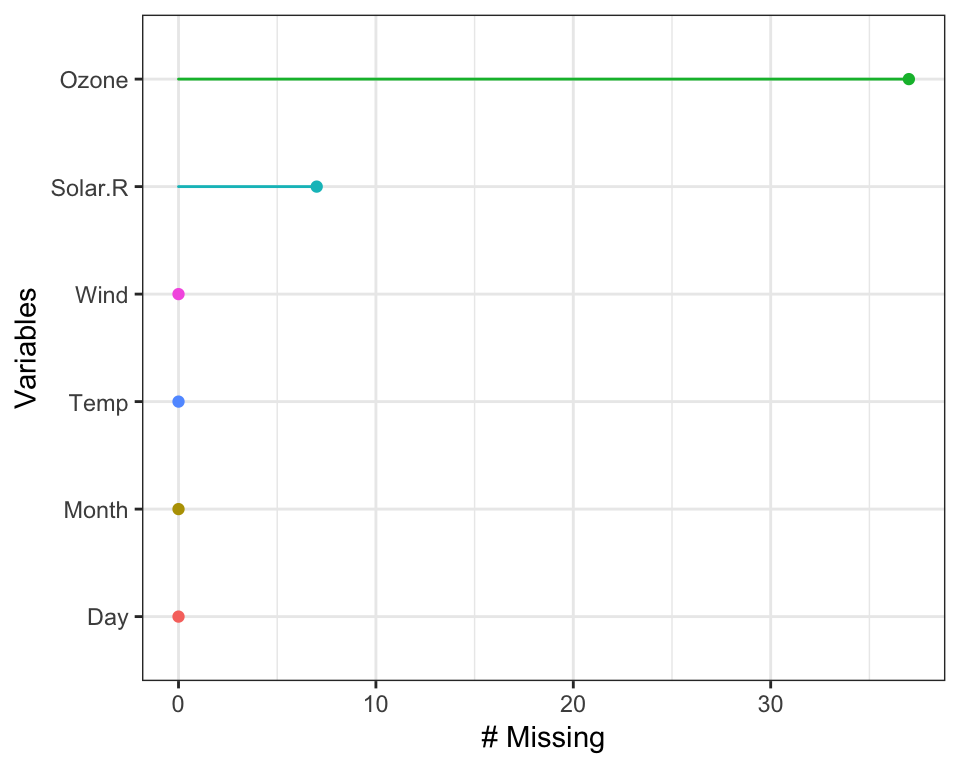 This creates a ggplot2 object with the number of missing values for each variable, ordered from most missing to least missing. Under the hood, this is powered using miss_var_summary(), described later.