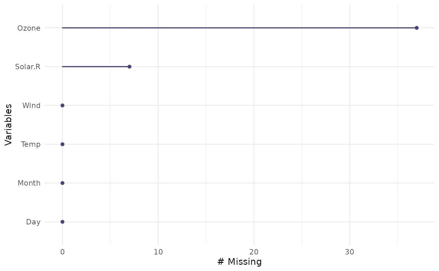 This is a visual analogue to miss_var_summary. It draws a ggplot of the