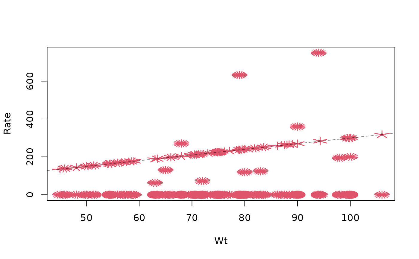 sunflowerplot(Rate ~ Wt, Remifentanil)