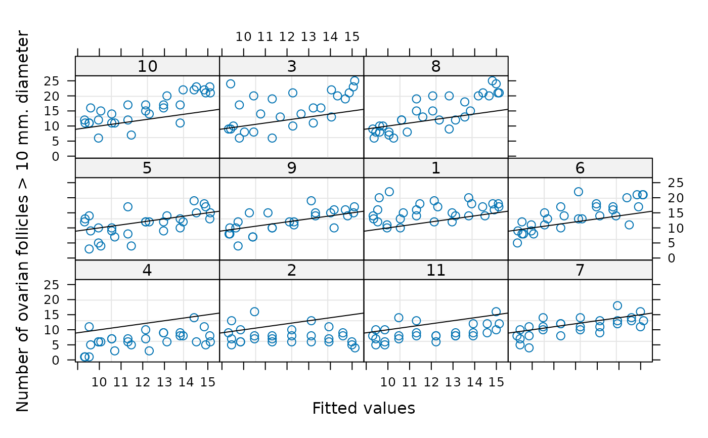 plot(fm1, follicles ~ fitted(.) | Mare, abline = c(0,1))