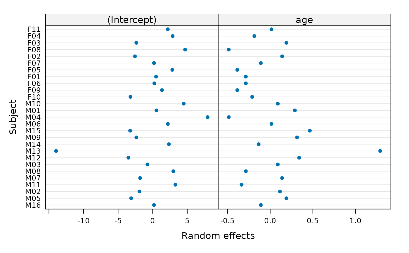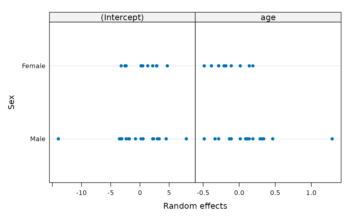 Trellis dot-plot of the random effects is generated, with a different