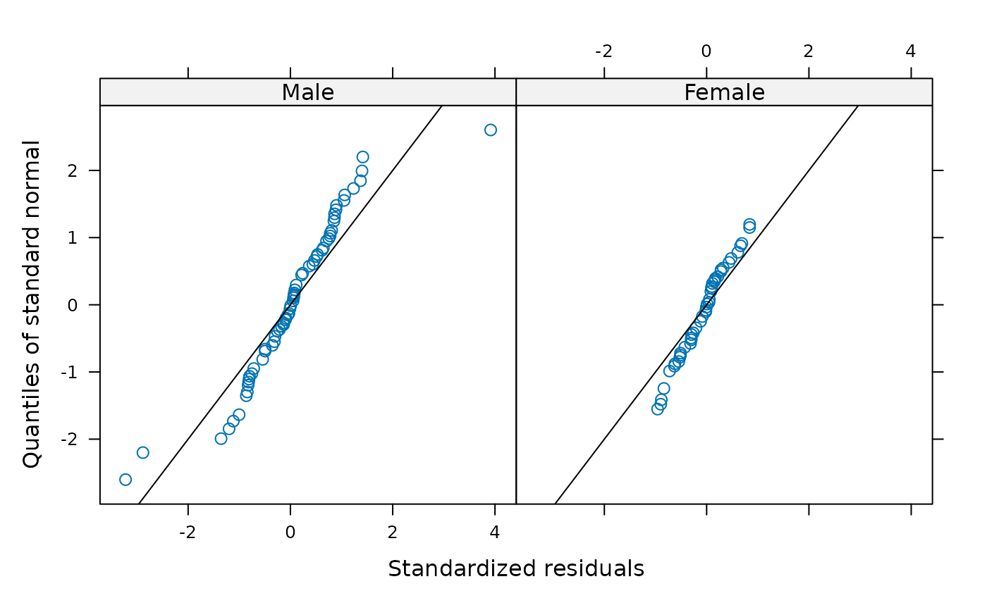 qqnorm(y, form, abline, id, idLabels, grid, ...)an object inheriting from class "lme", representing