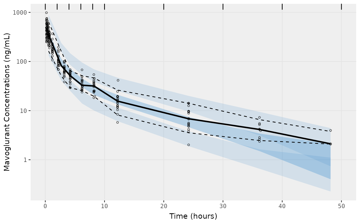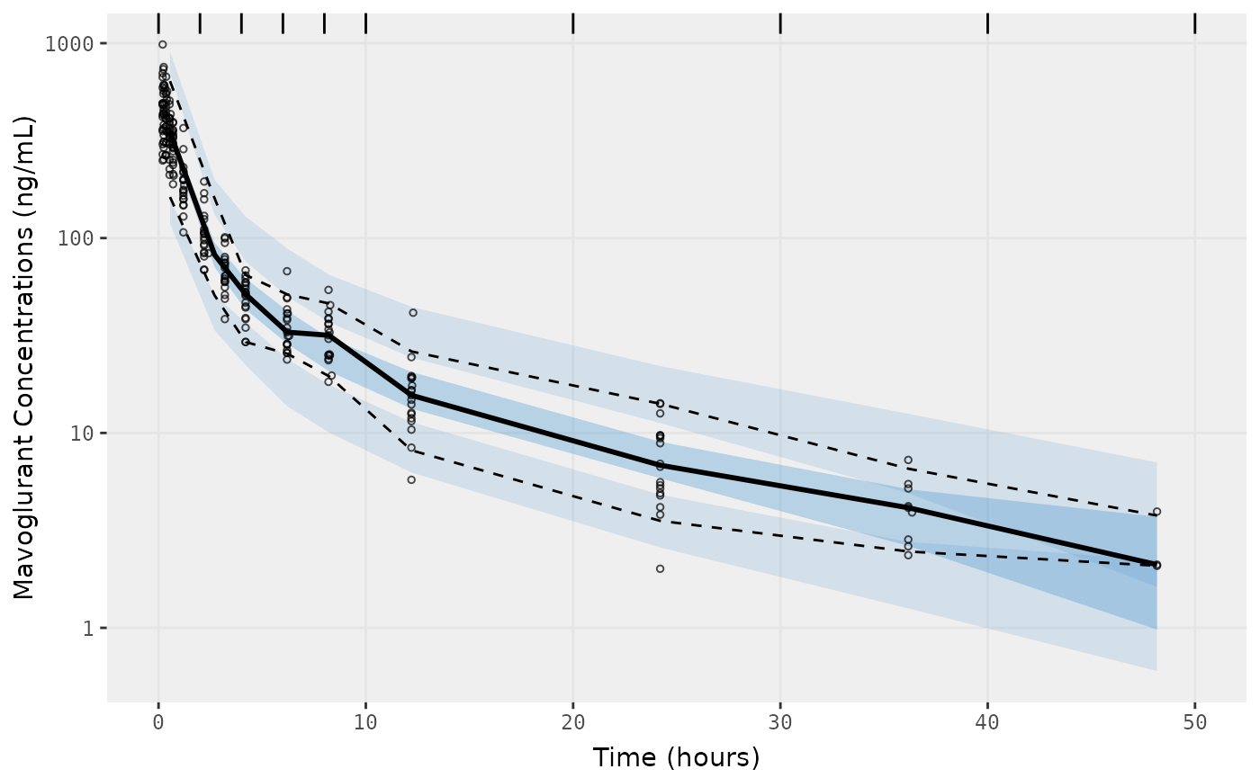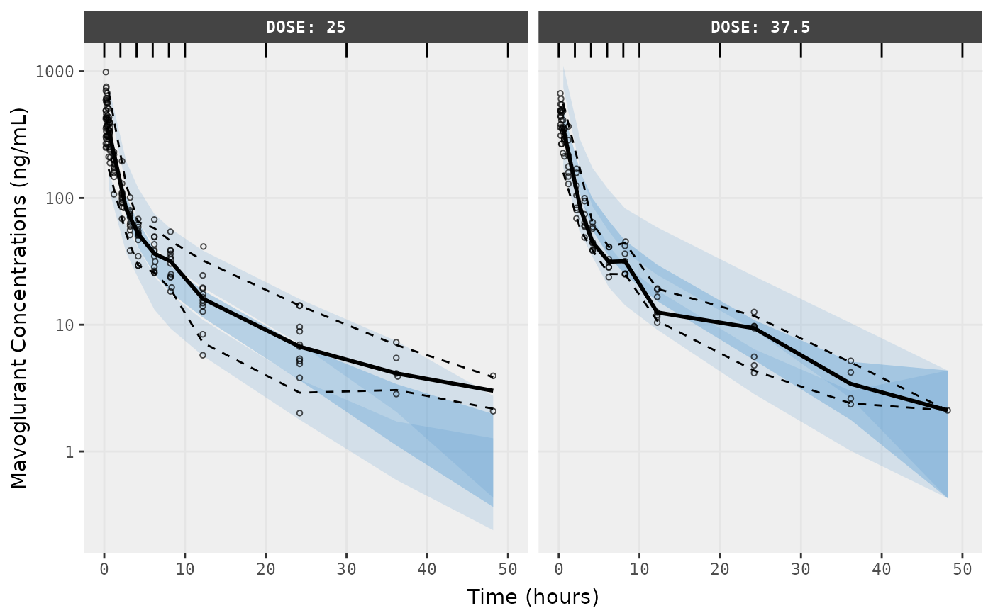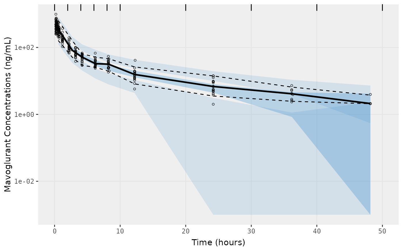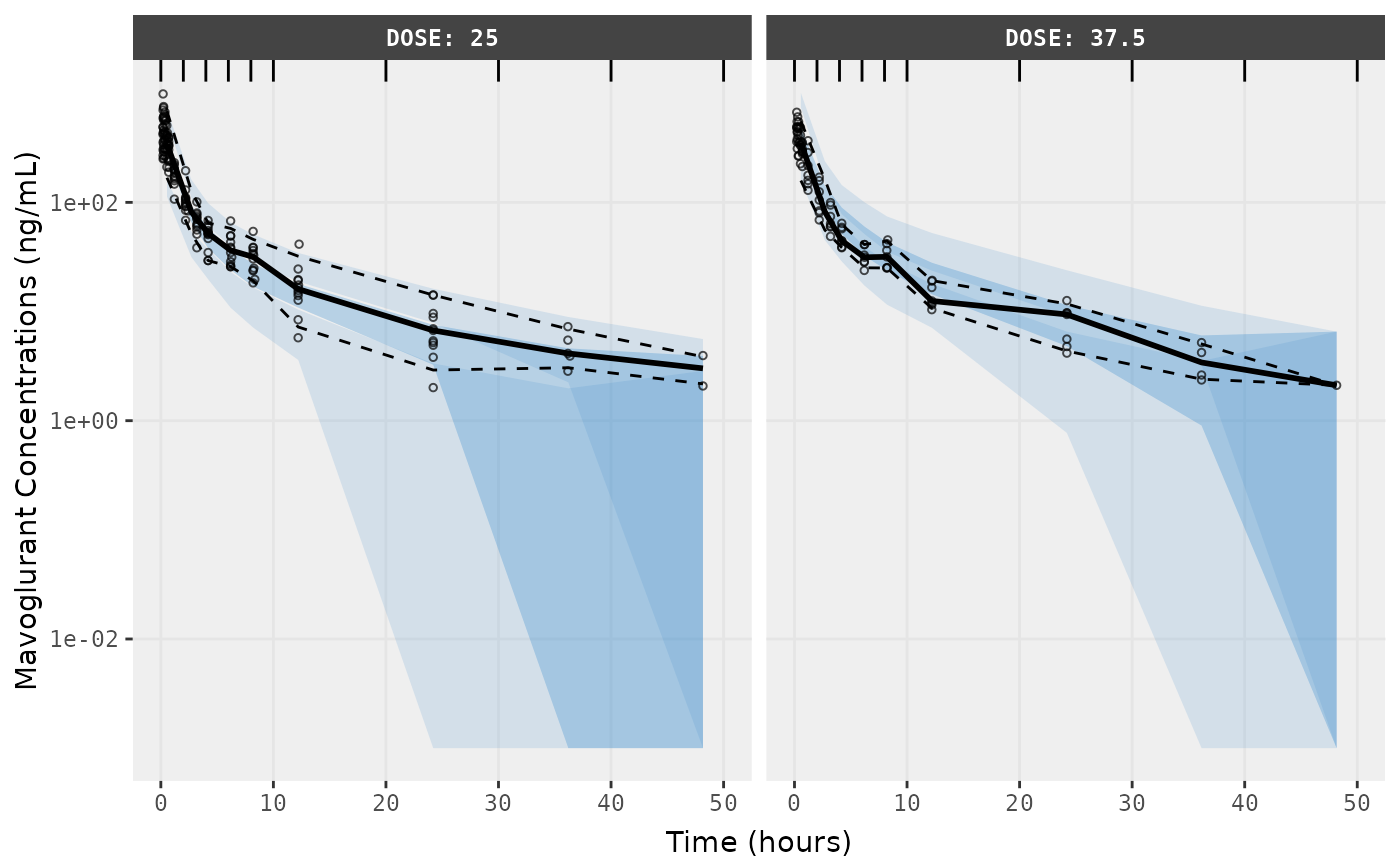 f2 <- vpcPlot(fit,n=500, show=list(obs_dv=T), bins = c(0, 2, 4, 6, 8, 10, 20, 30, 40, 50), log_y=TRUE,
