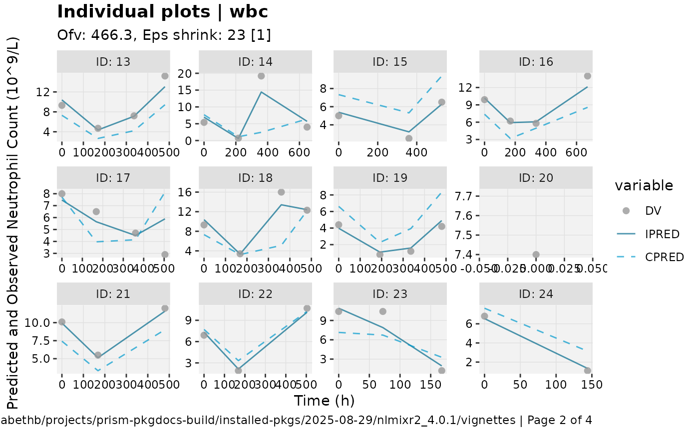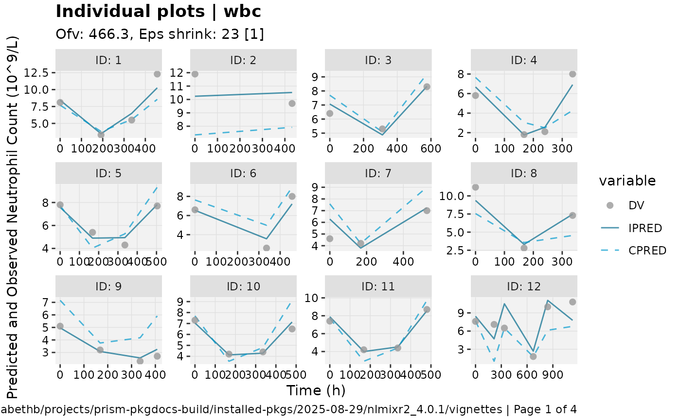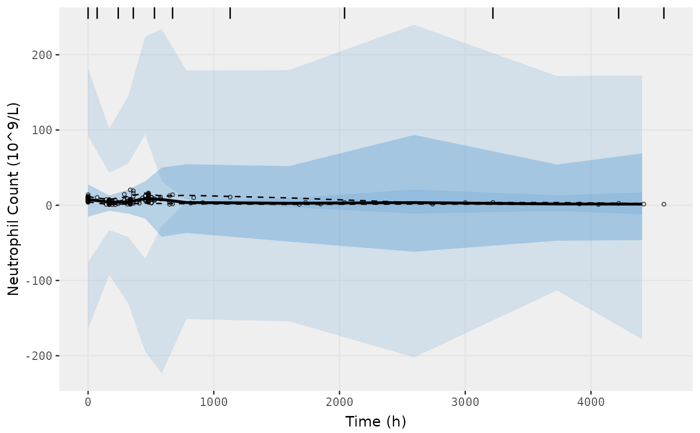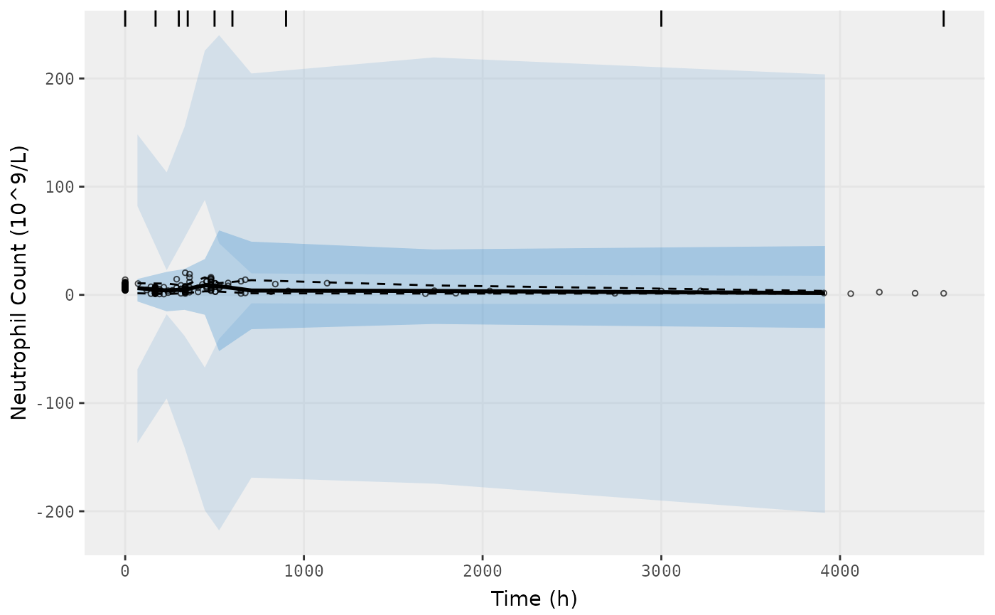 show=list(obs_dv=TRUE), ylab = "Neutrophil Count (10^9/L)", xlab = "Time (h)")