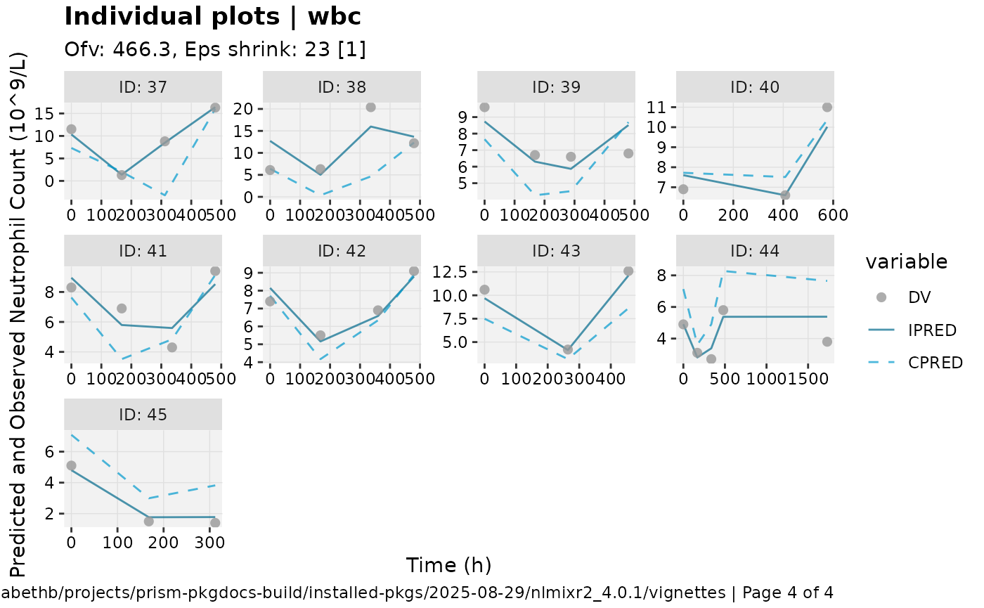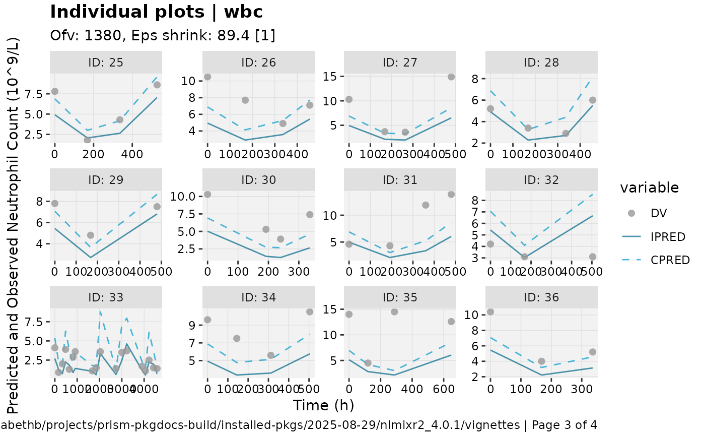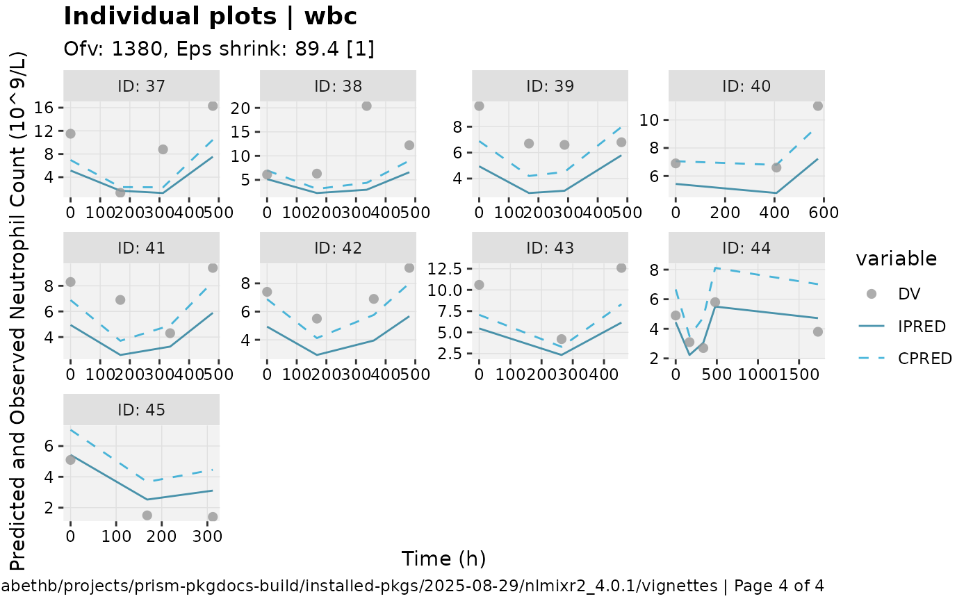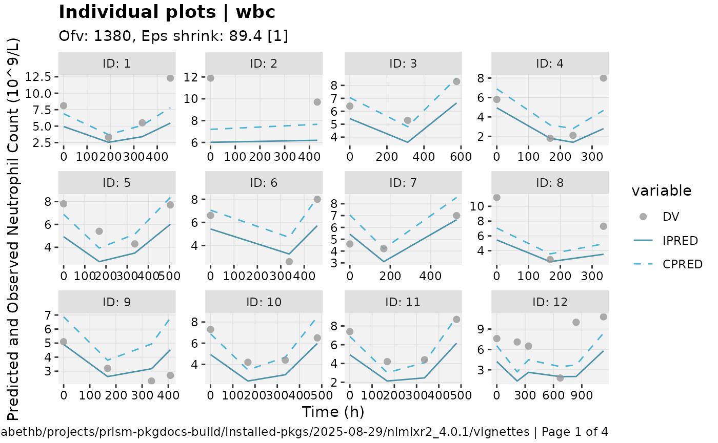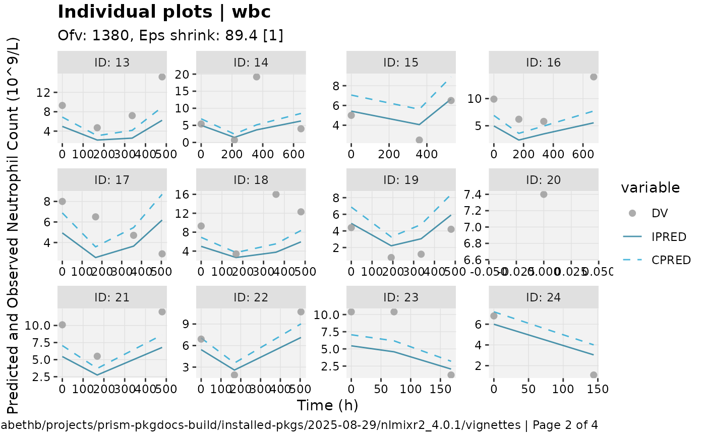 show=list(obs_dv=TRUE), ylab = "Neutrophil Count (10^9/L)", xlab = "Time (h)")