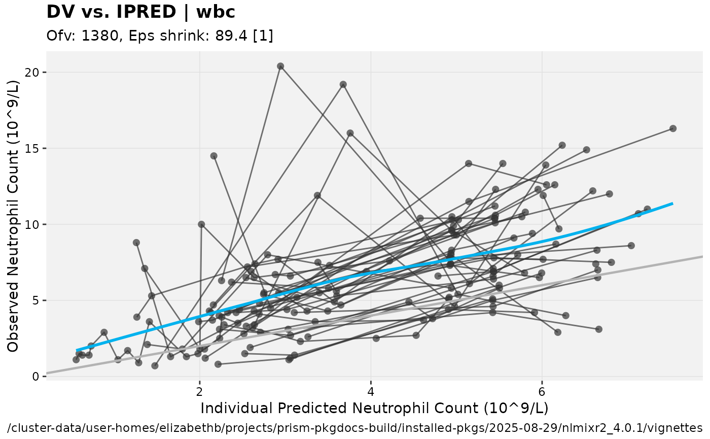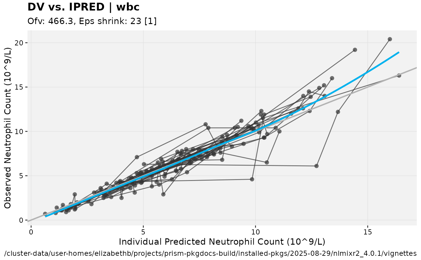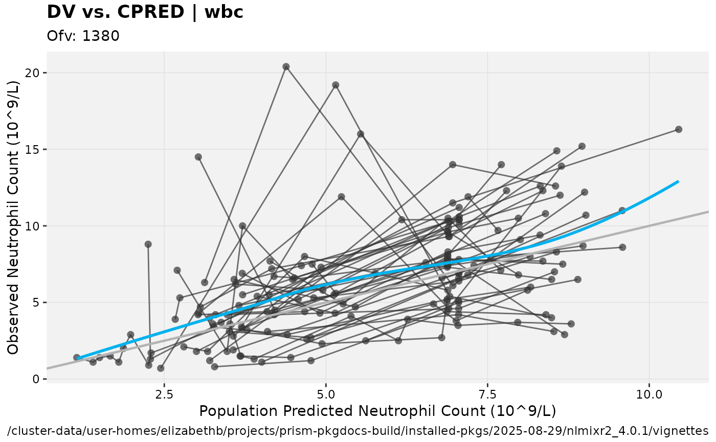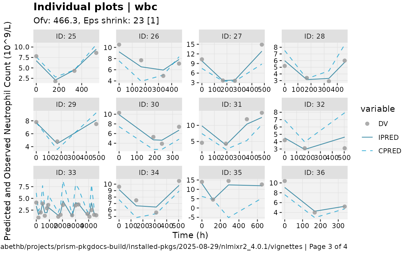 show=list(obs_dv=TRUE), ylab = "Neutrophil Count (10^9/L)", xlab = "Time (h)")