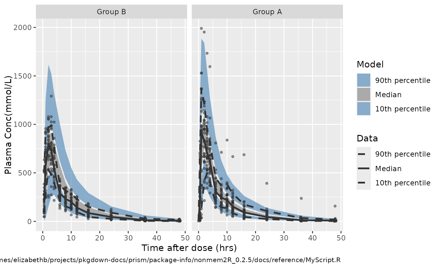 vpcfig2.RdThis function creates VPC using output files from the vpc command in Pearl Speaks NONMEM (PsN). Graphs are generated using the ggplot2 package and the return object is an ggplot class and can be further modified, see details below and documentation for ggplot2 for further details.