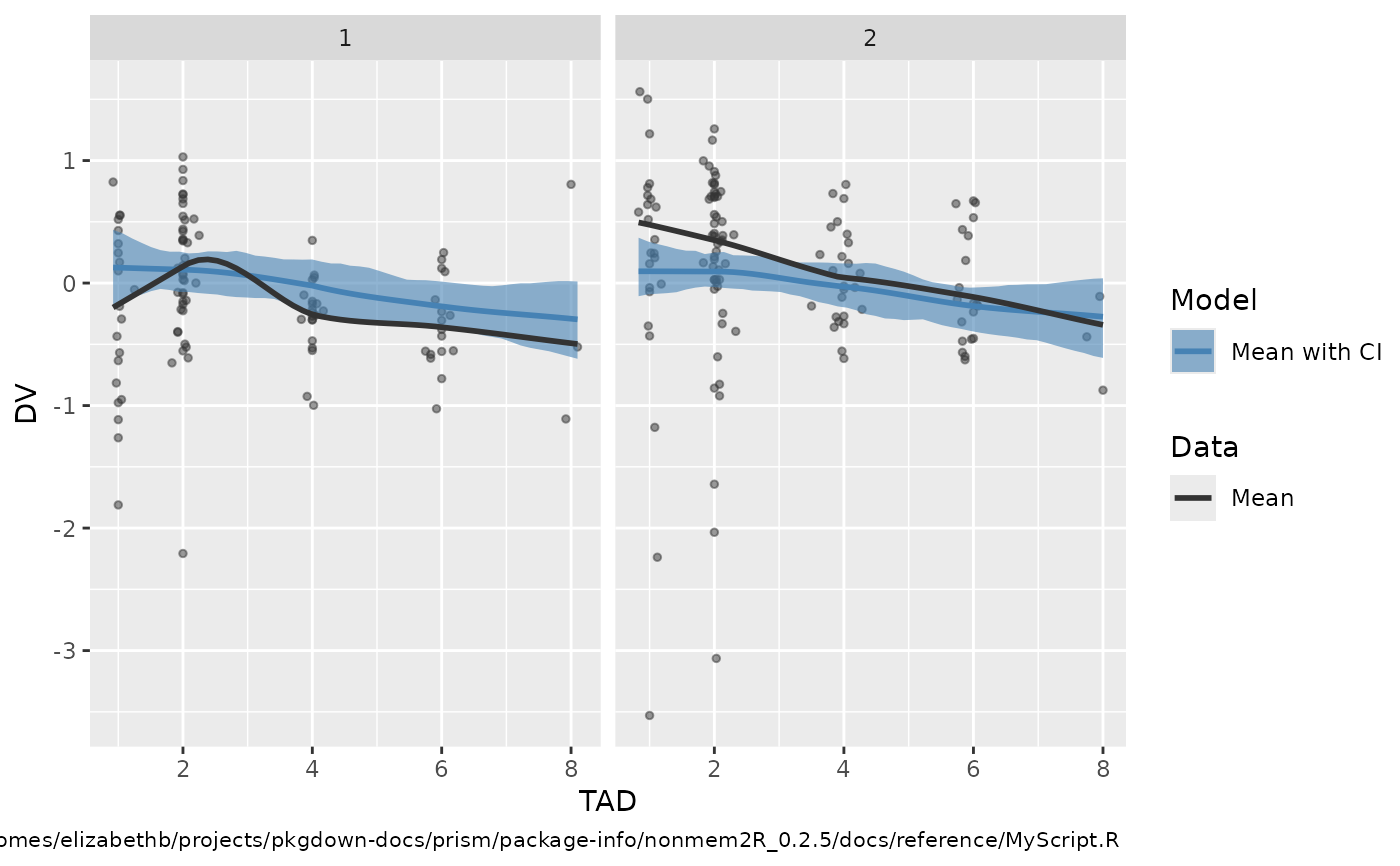 vpcfig3.RdThis function compile VPC simulated data from the vpc command in Pearl Speaks NONMEM (PsN). The complied data is then plotted (unless type=0) and returned (ggplot-object) and can then be further modifed.