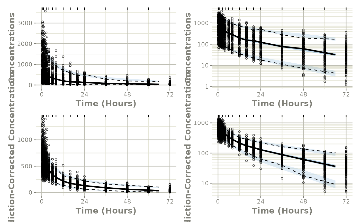 #> # f <dbl>, rescv <dbl>, tad <dbl>, dosenum <dbl>From here we simply use vpcPlot() in conjunction with the vpc package to get the regular and prediction-corrected VPCs and arrange them on a single plot: