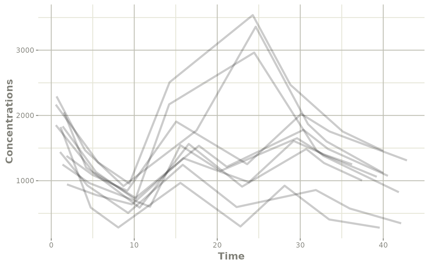 #> ℹ doneLets say that in this case instead of a single dose, we want to see what the concentration profile is with a single day of BID dosing. In this case is done by creating a quick event table: