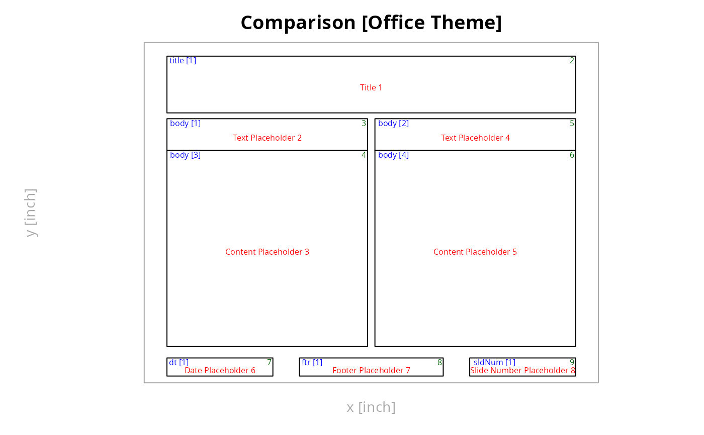 The location of the bounding box associated to a placeholder within a slide is specified with the left top coordinate, the width and the height. These are defined in inches: