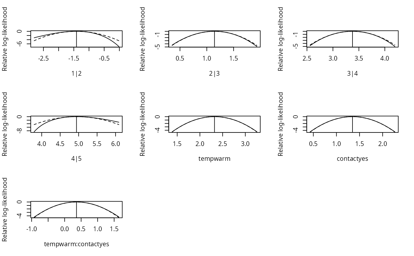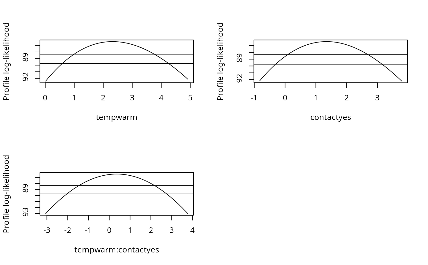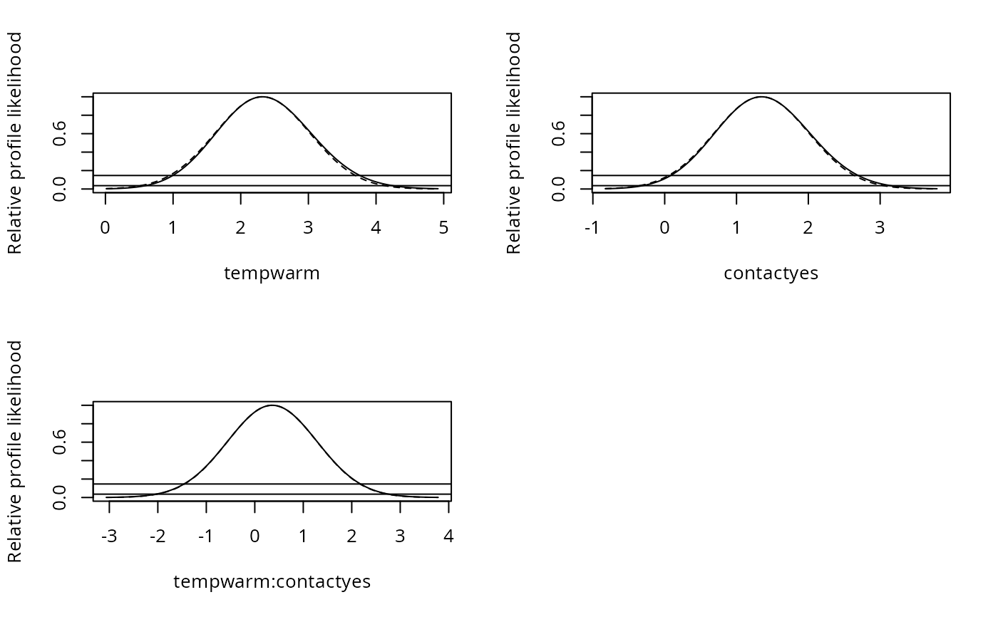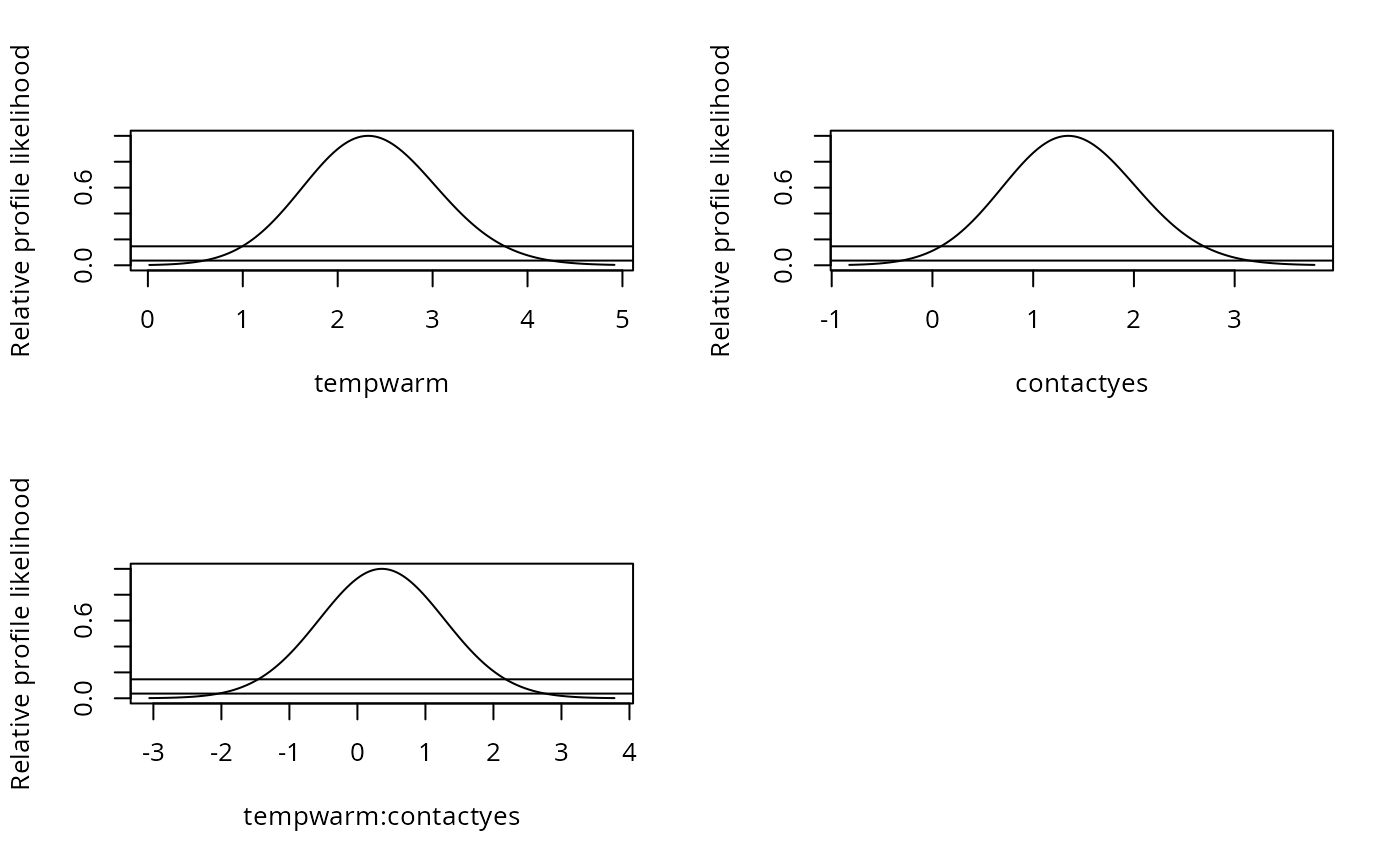 #> tempwarm:contactyes -1.45110279 2.1702006