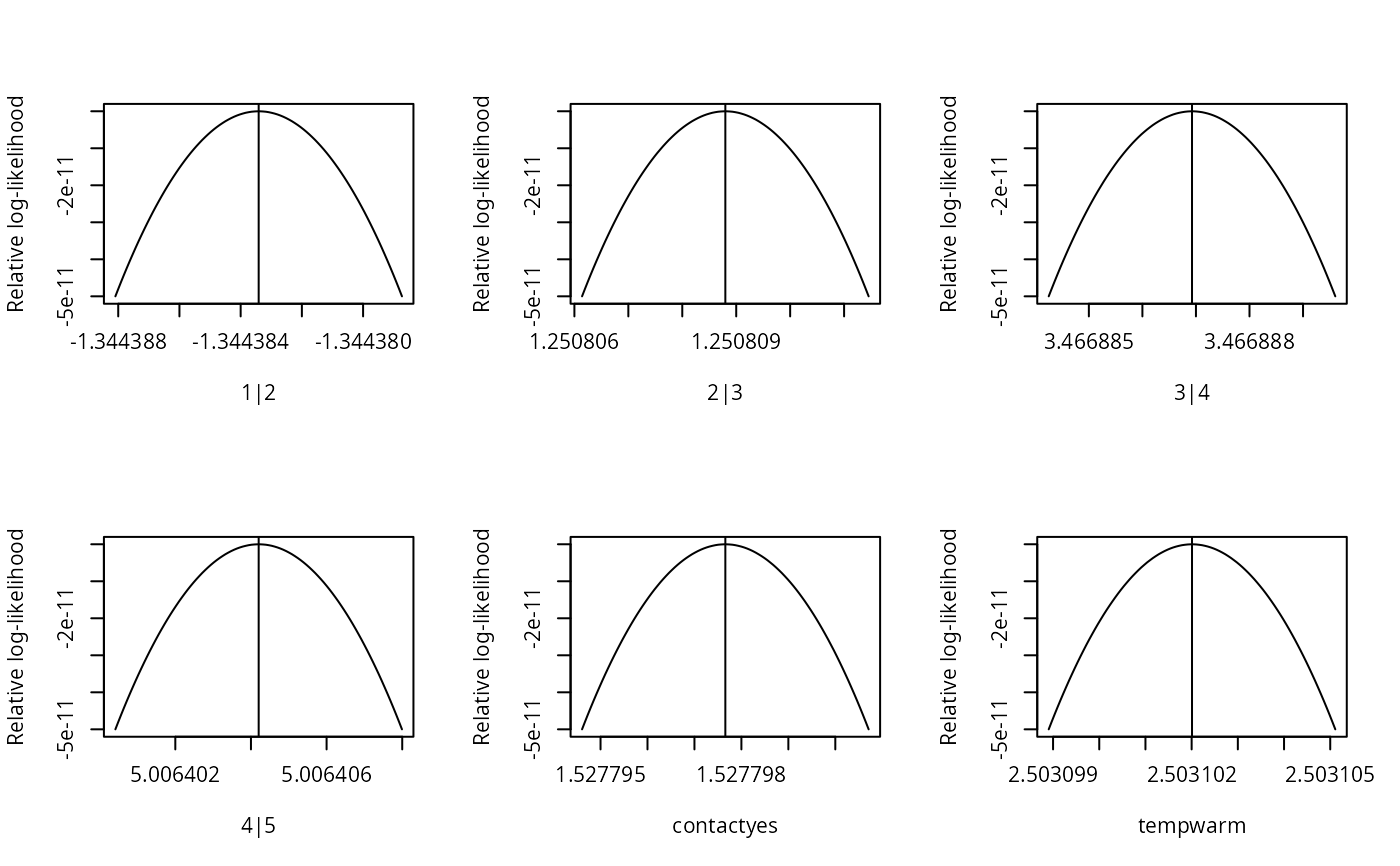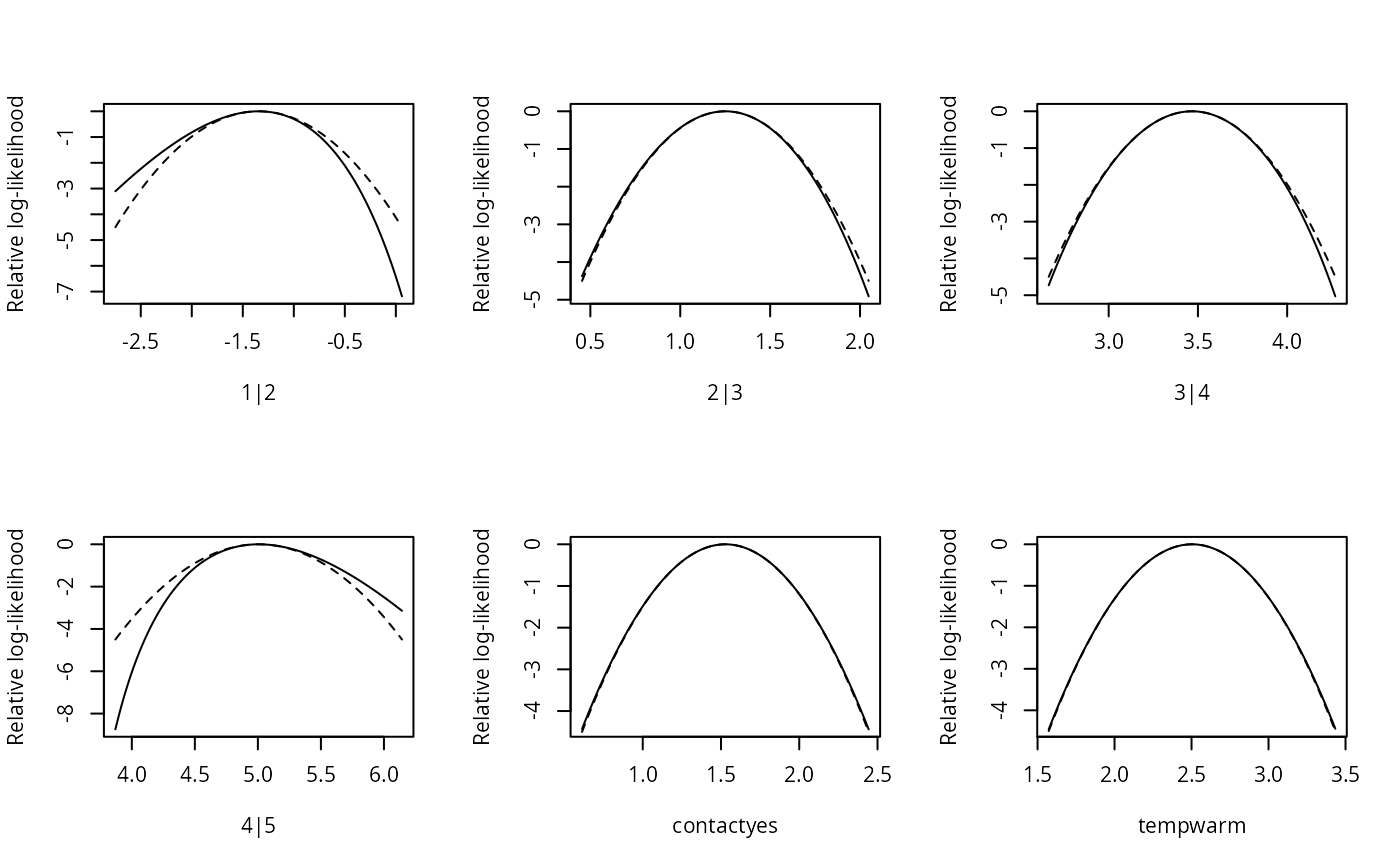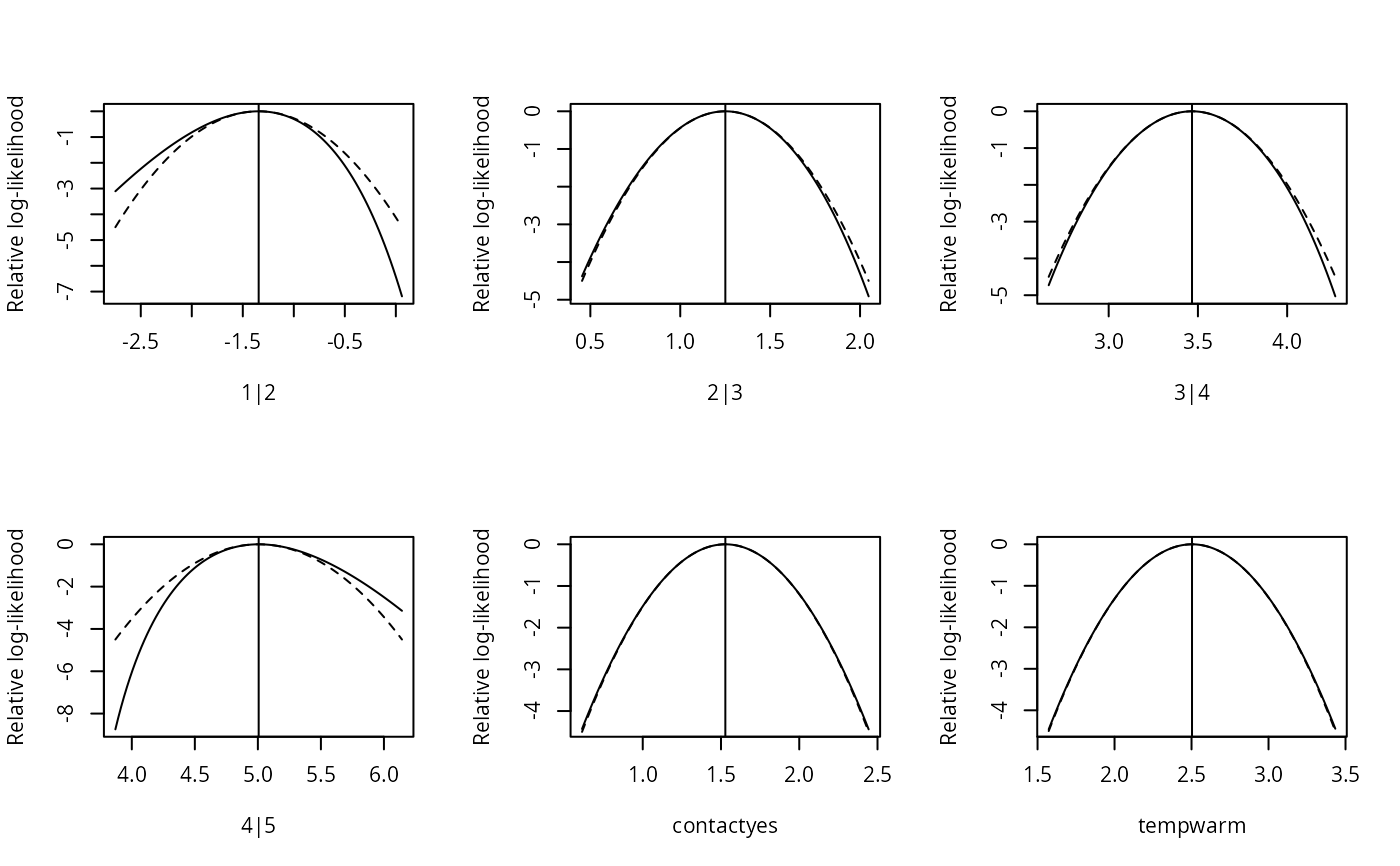 slice.clm.RdSlice likelihood and plot the slice. This is usefull for illustrating the likelihood surface around the MLE (maximum likelihood estimate) and provides graphics to substantiate (non-)convergence of a model fit. Also, the closeness of a quadratic approximation to the log-likelihood function can be inspected for relevant parameters. A slice is considerably less computationally demanding than a profile.