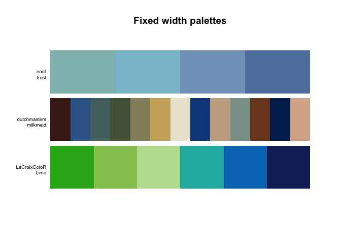 The palettes are divided into 2 groups; discrete and continuous. For discrete palette you have the choice between the fixed width palettes and dynamic palettes. Most common of the two are the fixed width palettes which have a set amount of colors which doesn’t change when the number of colors requested vary like the following palettes:
