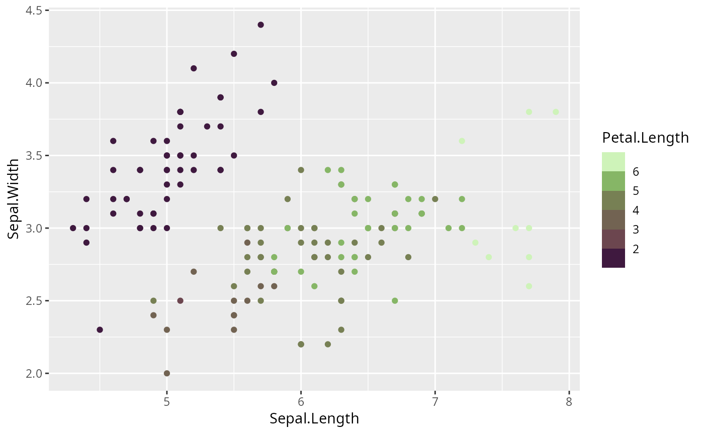 ggplot(iris, aes(x = Sepal.Length, y = Sepal.Width, colour = Petal.Length)) +