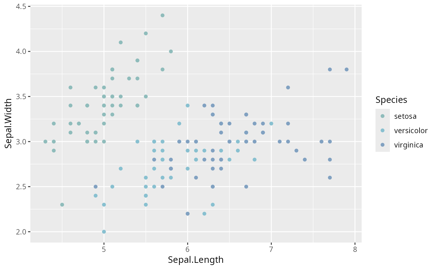 ggplot(iris, aes(x = Sepal.Length, y = Sepal.Width, colour = Species)) +