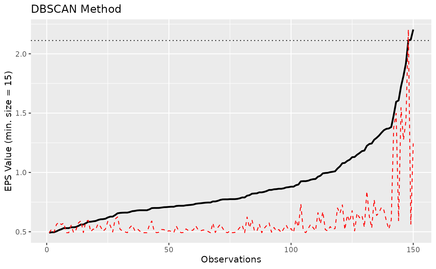 #> The DBSCAN method, based on the total clusters sum of squares, suggests that the optimal eps = 2.11193281281293 (with min. cluster size set to 15), which corresponds to 1 clusters.