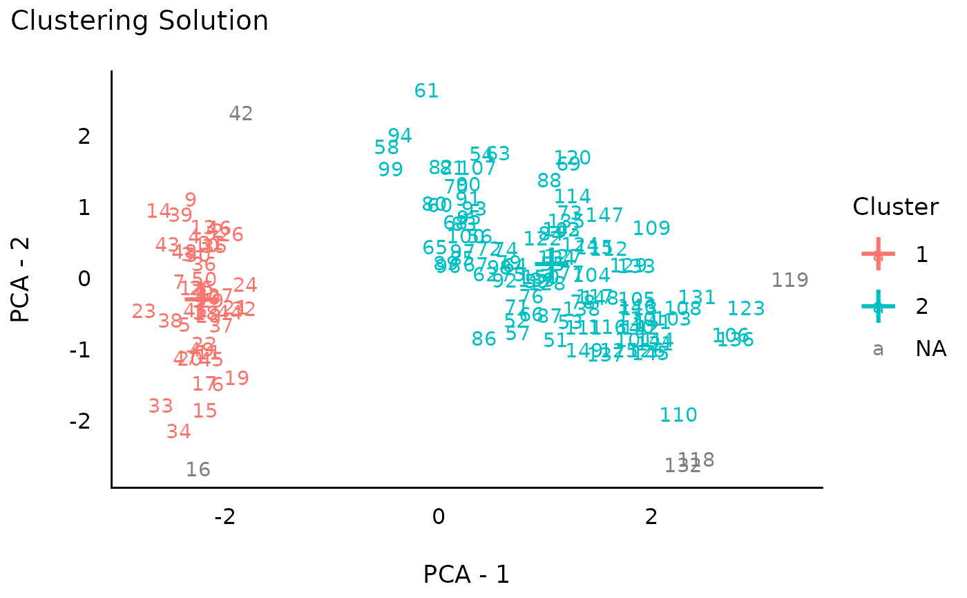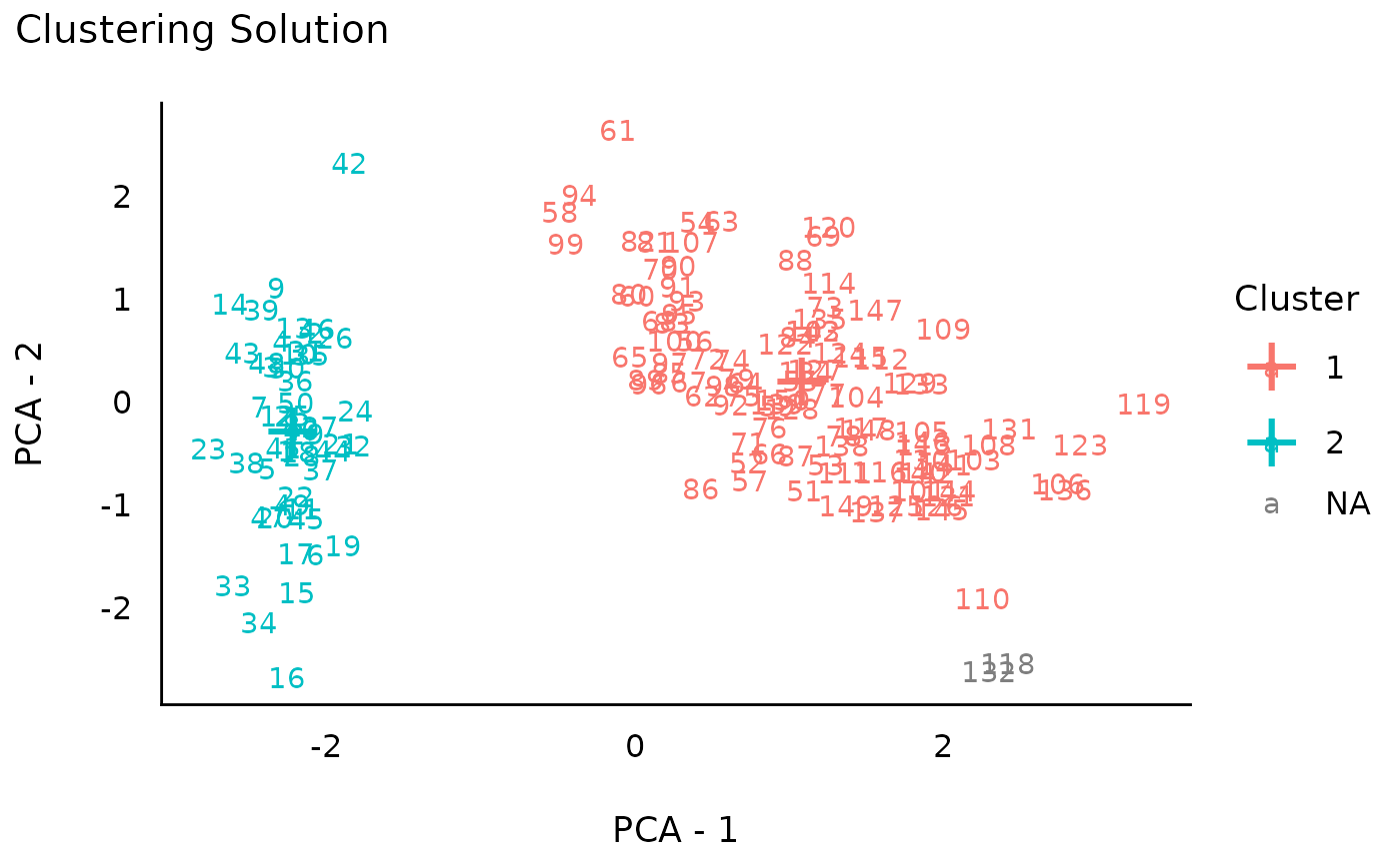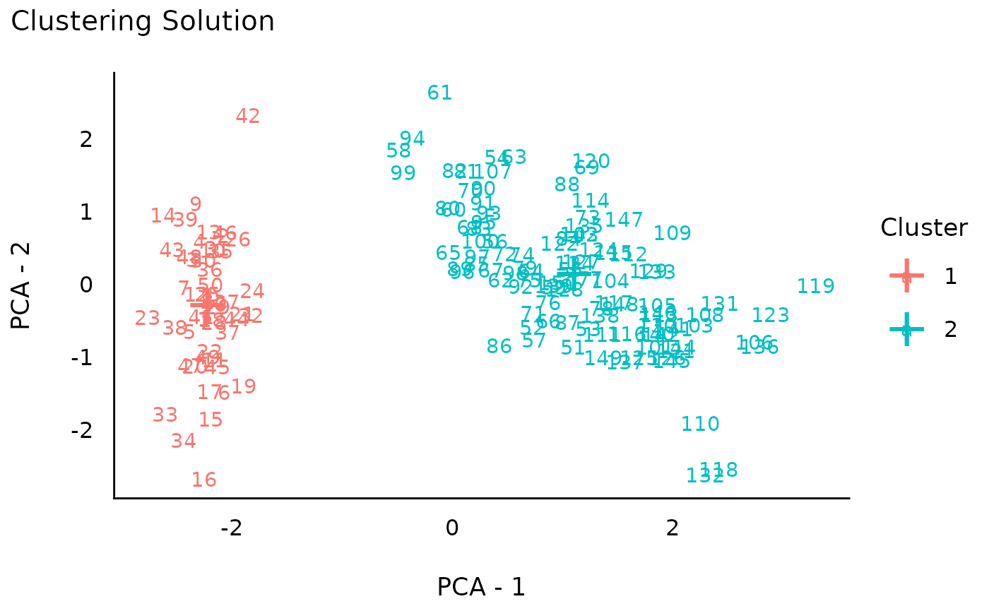 #> The 2 clusters accounted for 62.94% of the total variance of the original data.