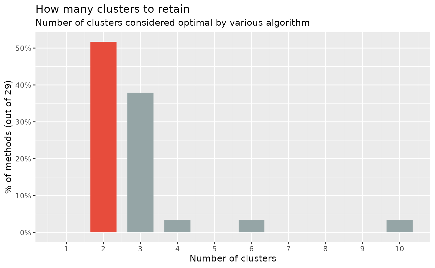 Because there is no clearly better method, we have implemented in easystats a consensus-based algorithm that runs many of these methods, and returns the number of clusters that is the most agreed upon.