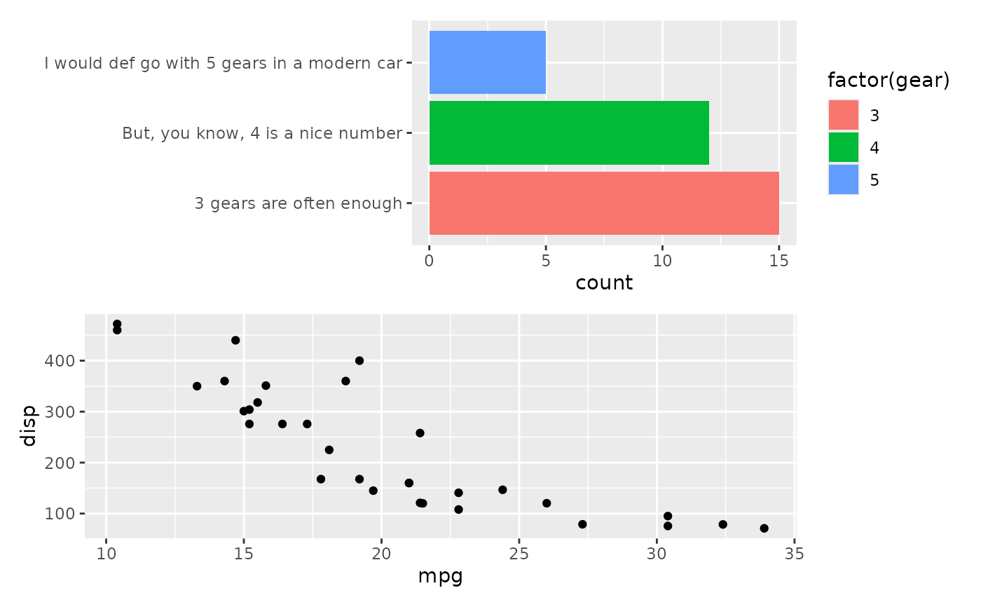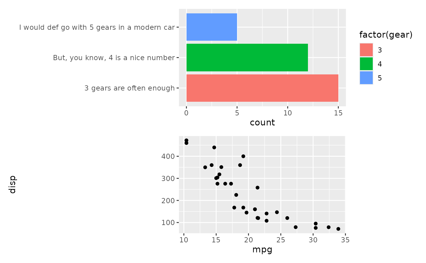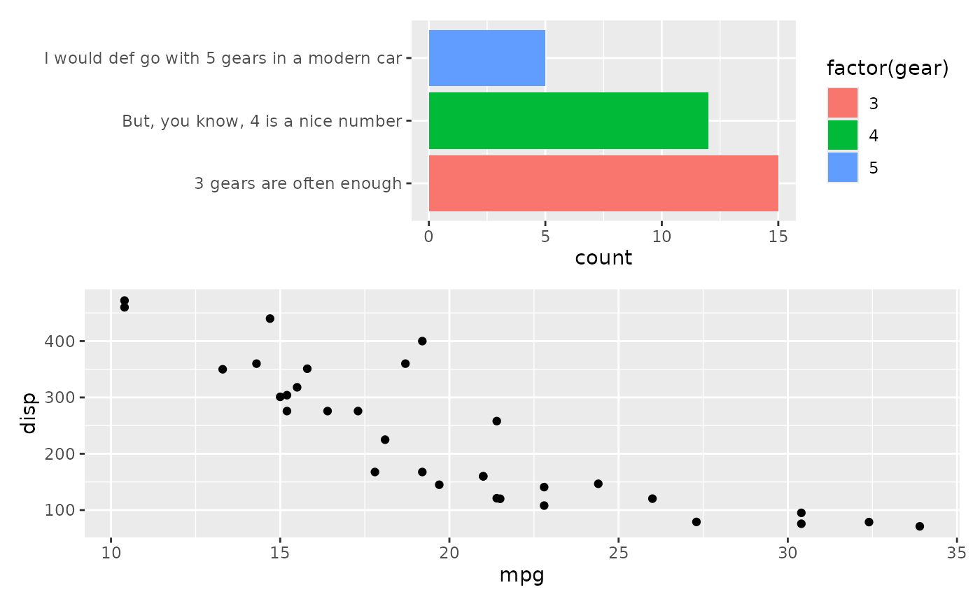 p2 <- ggplot(mtcars) + geom_point(aes(mpg, disp))