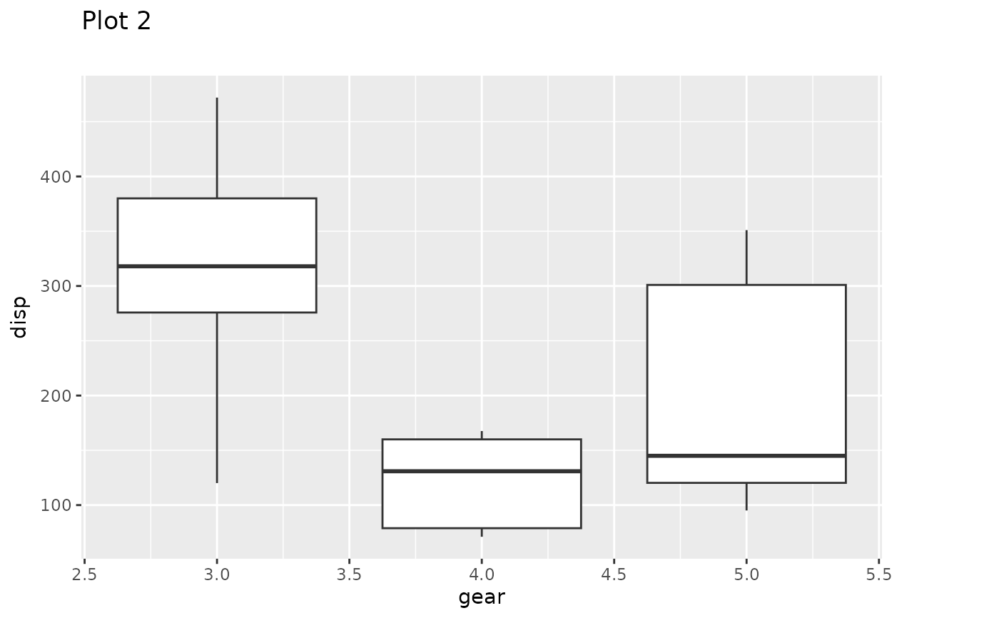 geom_boxplot(aes(gear, disp, group = gear)) +