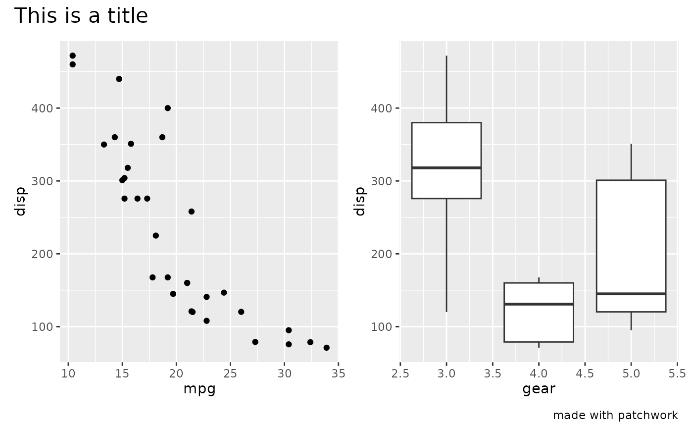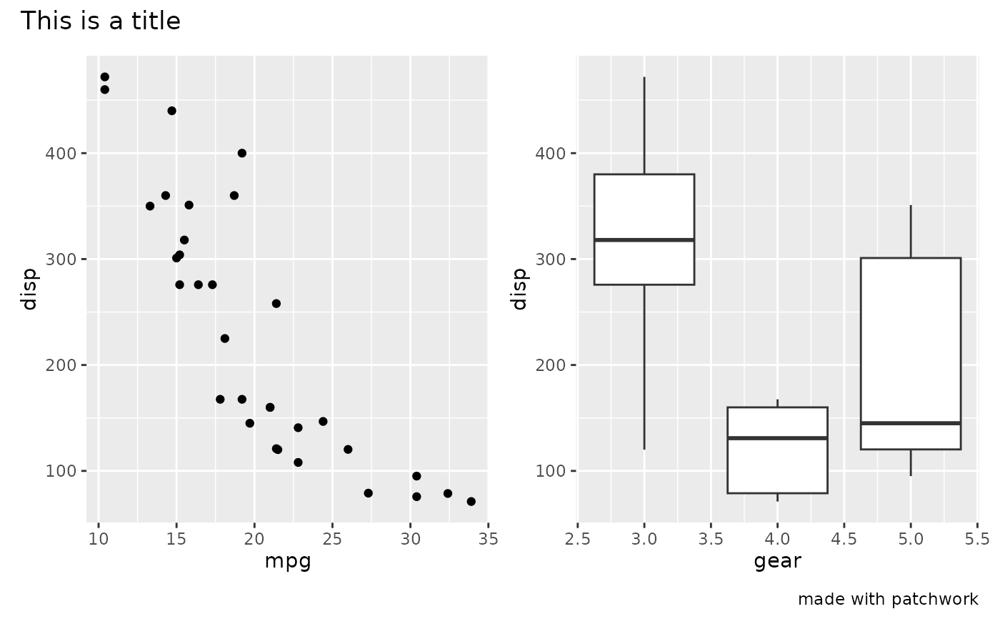 p1 + p2 + plot_annotation('This is a title', caption = 'made with patchwork')