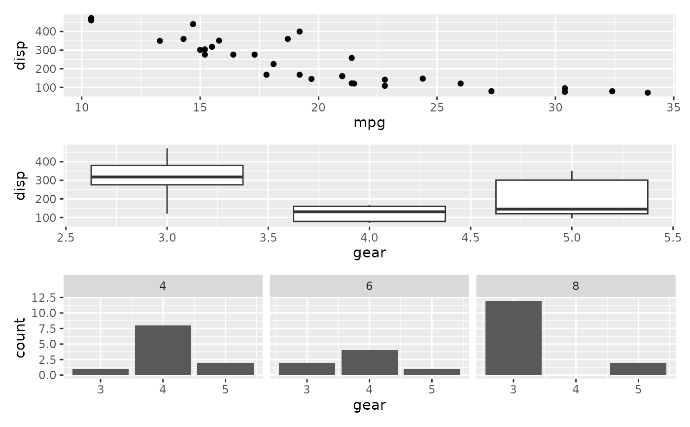 p2 <- ggplot(mtcars) + geom_boxplot(aes(gear, disp, group = gear))
