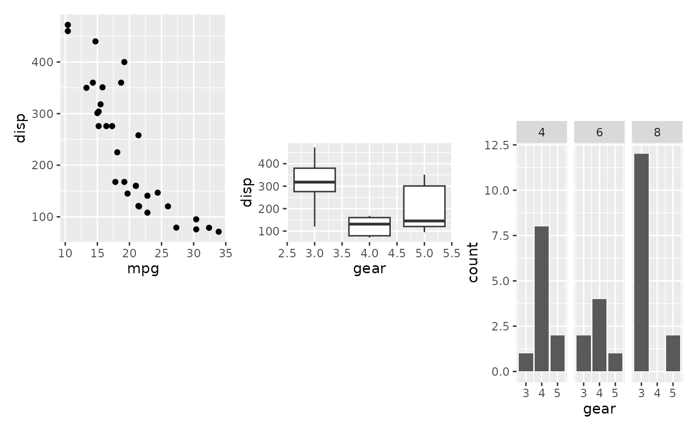 p2 <- ggplot(mtcars) + geom_boxplot(aes(gear, disp, group = gear))