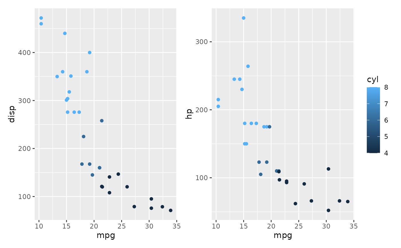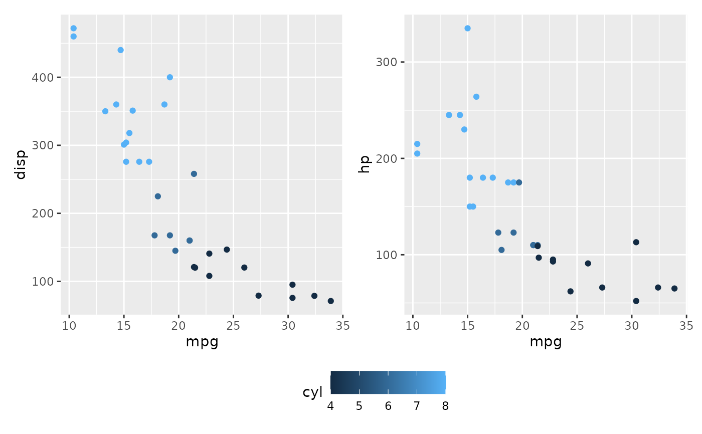 p6 <- ggplot(mtcars) + geom_point(aes(mpg, disp, color=cyl))