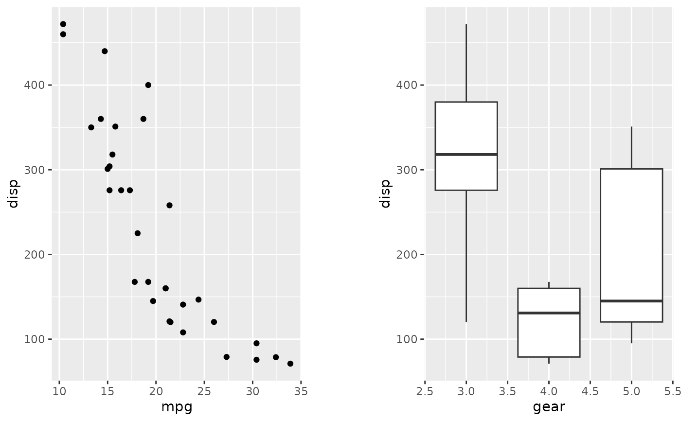 p2 <- ggplot(mtcars) + geom_boxplot(aes(gear, disp, group = gear))