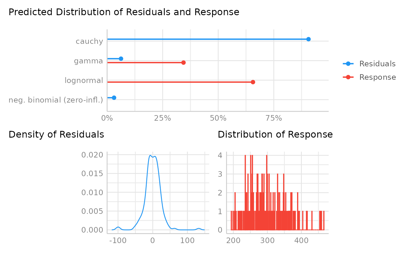 Choosing the right distributional family for regression models is essential to get more accurate estimates and standard errors. This function may help to check a models' distributional family and see if the model-family probably should be reconsidered. Since it is difficult to exactly predict the correct model family, consider this function as somewhat experimental.