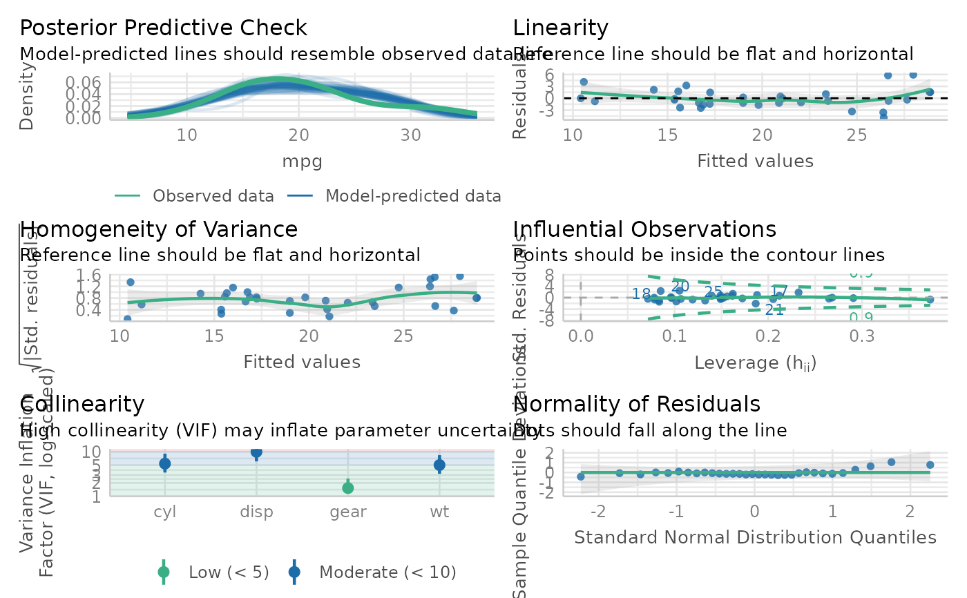 This function just prepares the data for plotting. To create the plots, see needs to be installed. Furthermore, this function suppresses all possible warnings. In case you observe suspicious plots, please refer to the dedicated functions (like check_collinearity(), check_normality() etc.) to get informative messages and warnings.