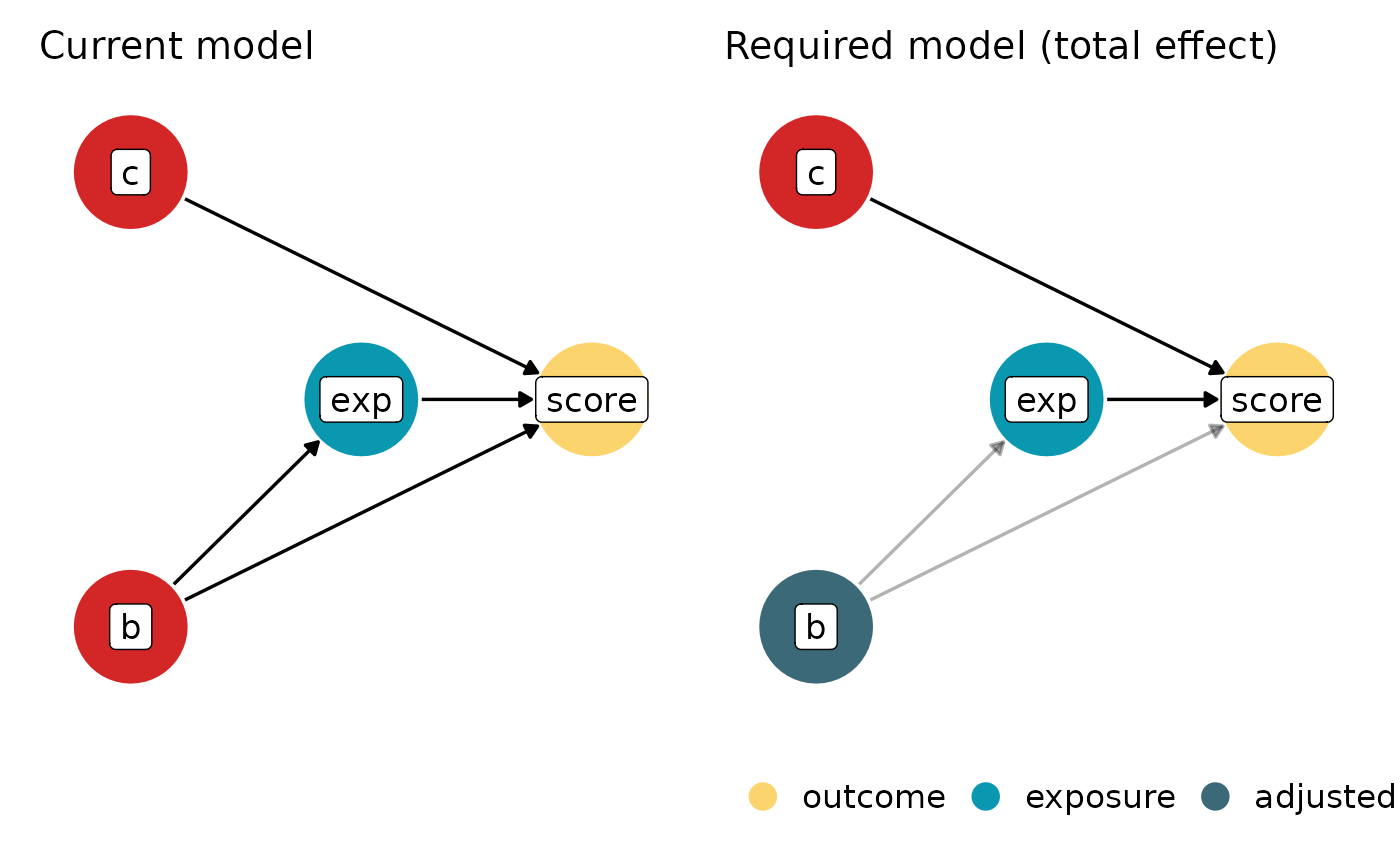 #> To estimate the direct and total effect, at least adjust for `b`. Currently, the model does not adjust for any variables.