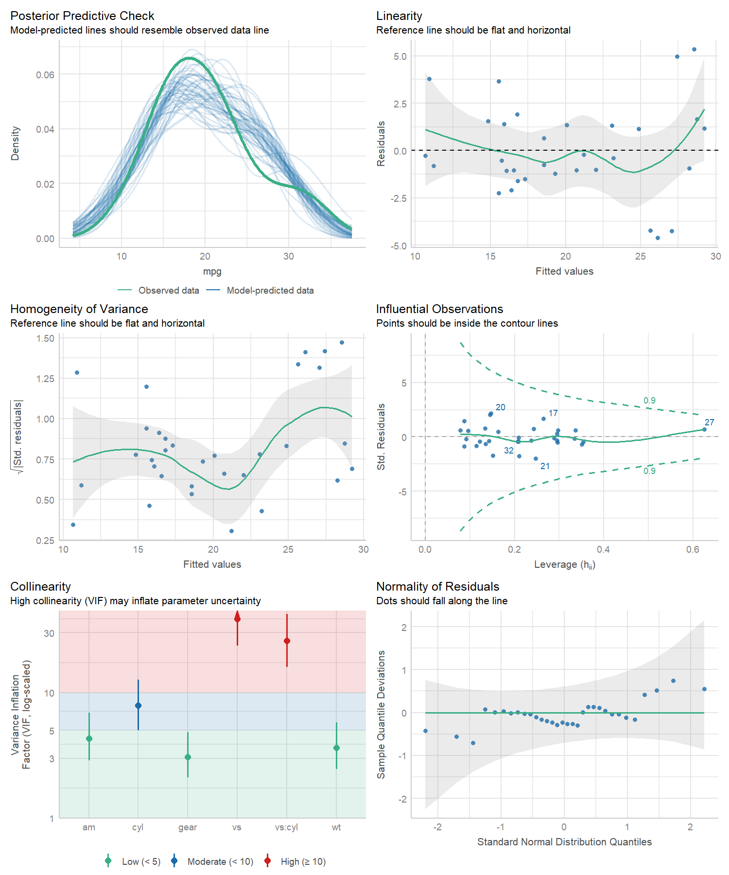 #> Warning: Heteroscedasticity (non-constant error variance) detected (p = 0.031).Comprehensive visualization of model checks
