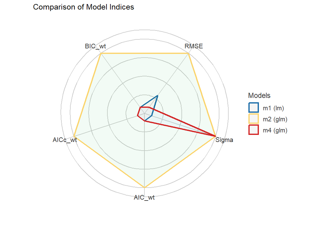 #> m3 | lmerMod | 23.438 | 25.592 | 0.00e+00 | 0.00e+00 | 0.00e+00 | 0.00%Visualisation of indices of models’ performance