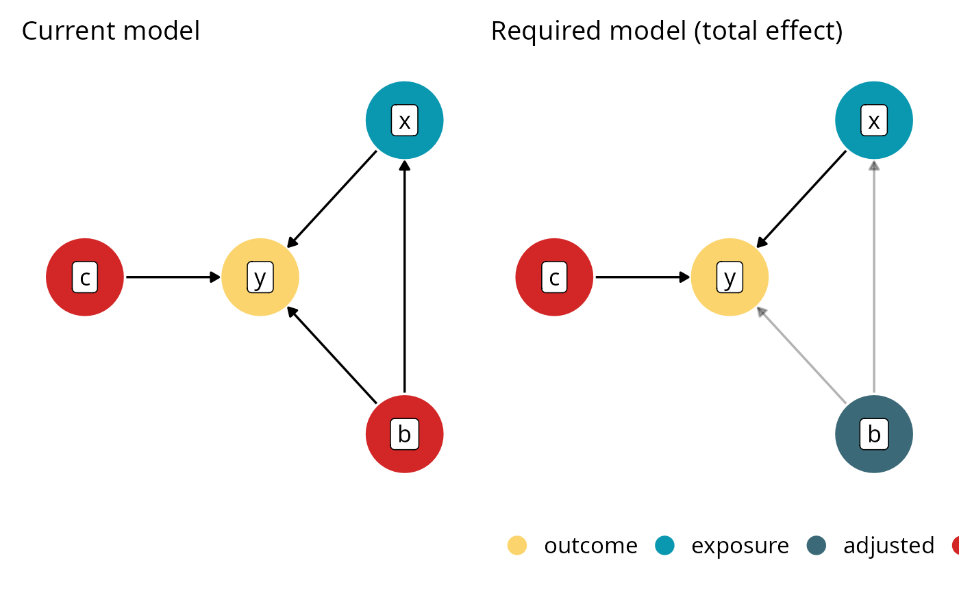 #> To estimate the direct and total effect, at least adjust for `b`. Currently, the model does not adjust for any variables.
