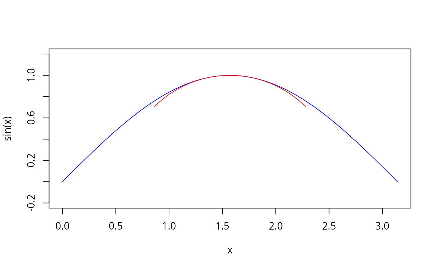 curve(sin(x), 0, pi, col="blue", asp=1)