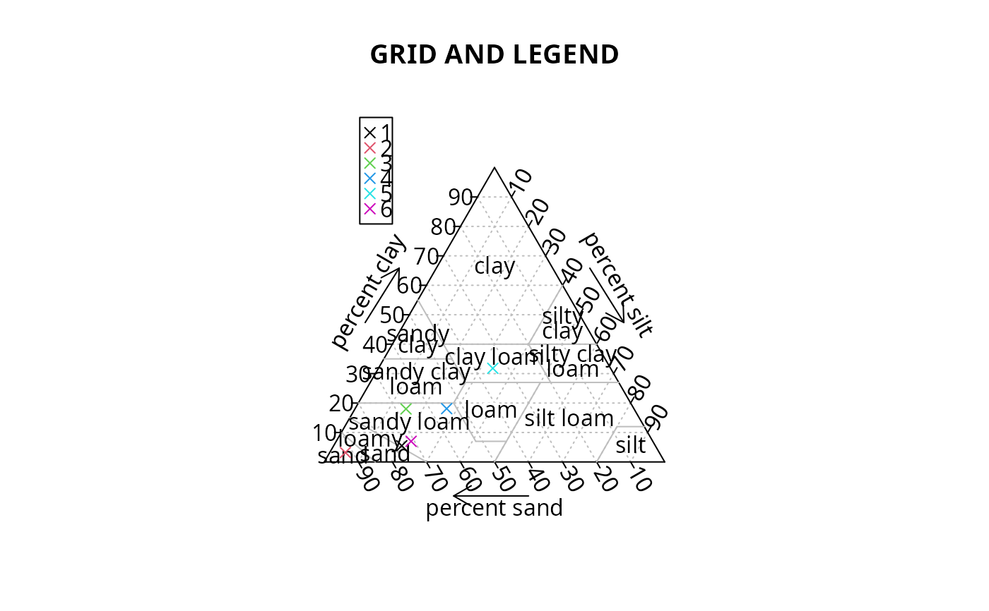 soiltex.return<-soil.texture(soils[1:6,], main="GRID AND LEGEND",