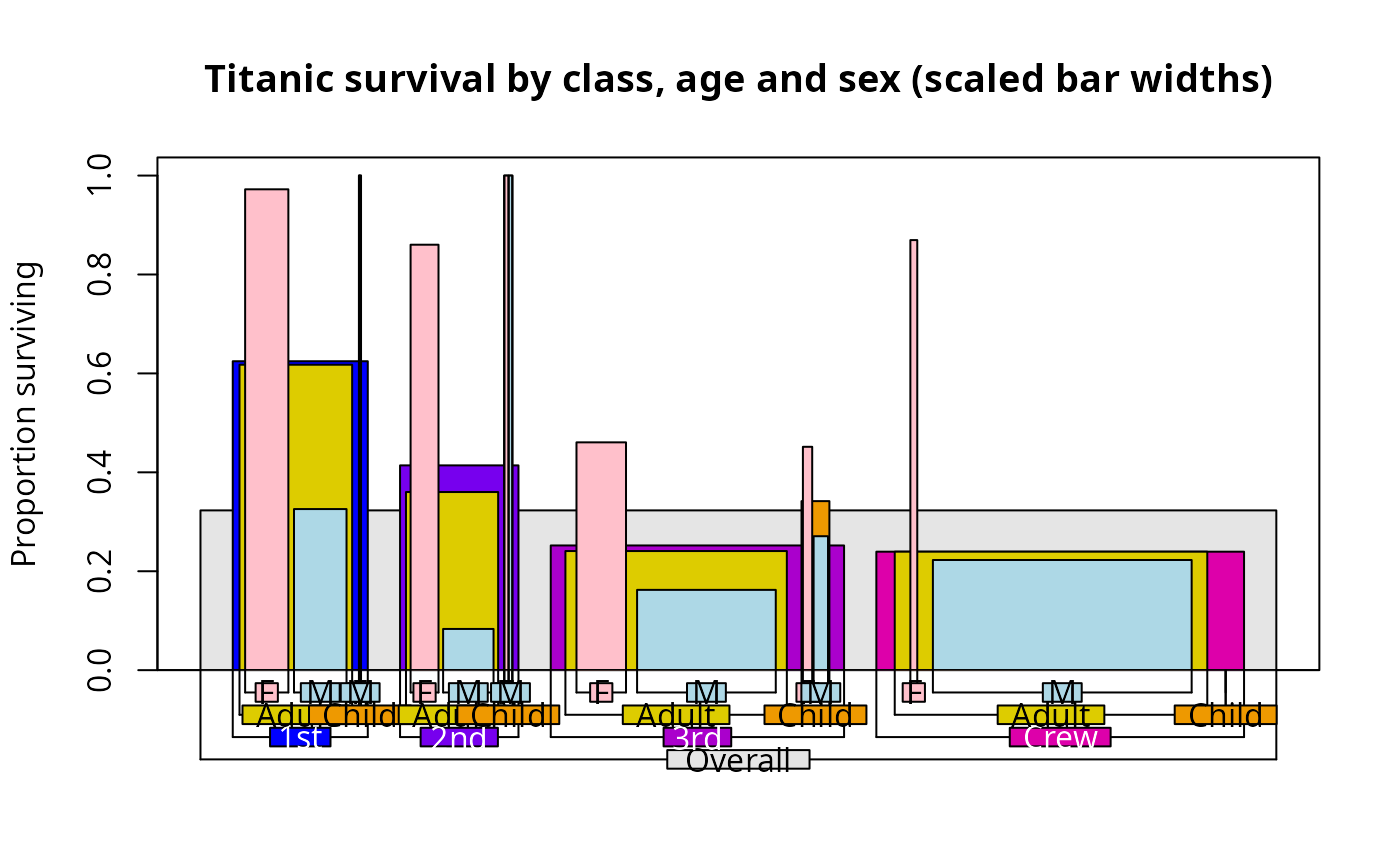 main="Titanic survival by class, age and sex (scaled bar widths)",