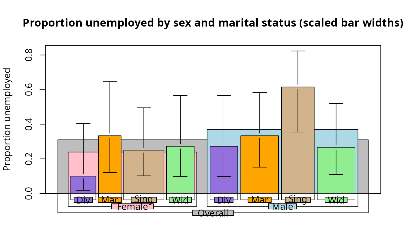 main="Proportion unemployed by sex and marital status (scaled bar widths)",