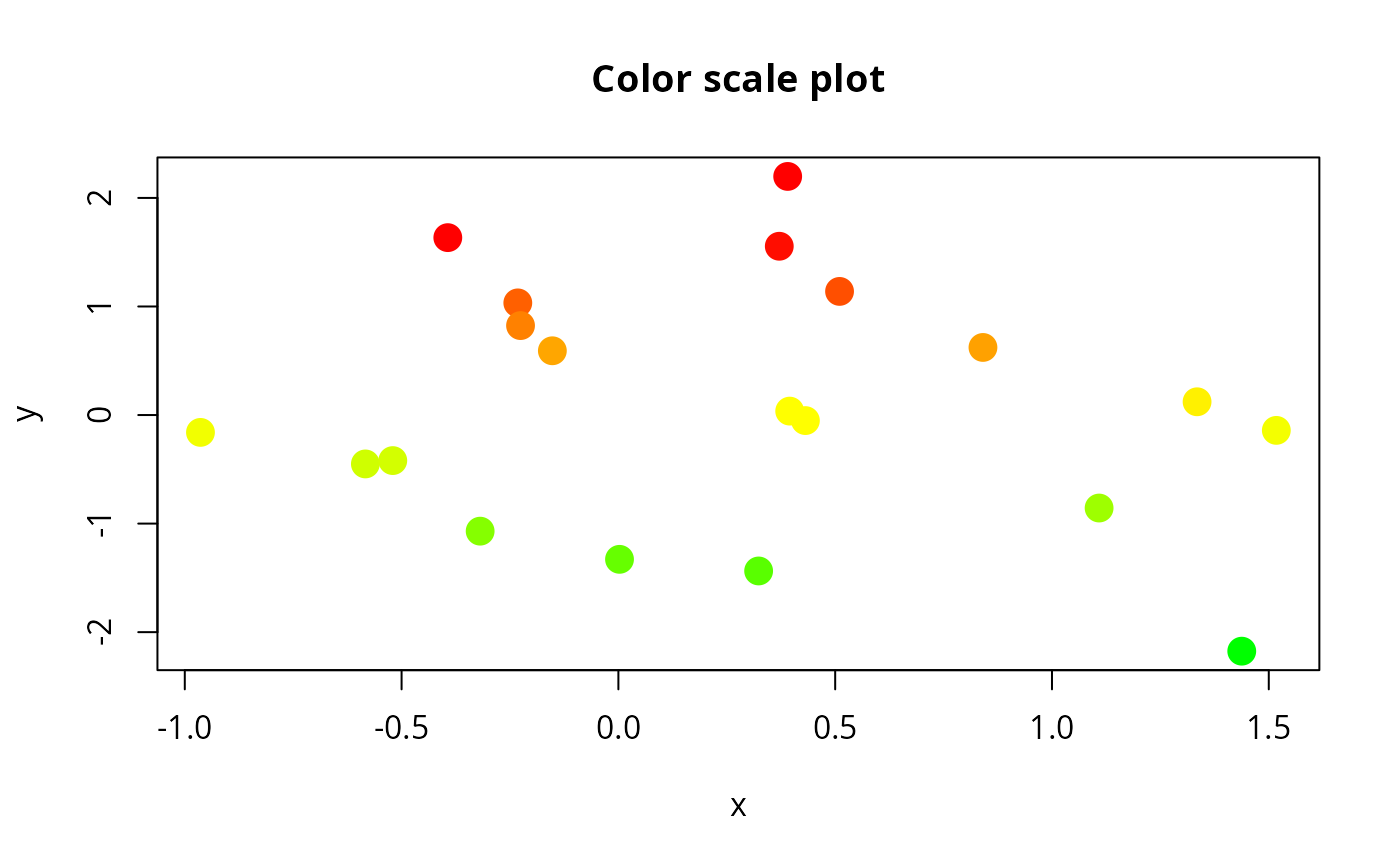 plot(x,y,col=color.scale(y,c(0,1,1),c(1,1,0),0),main="Color scale plot",
