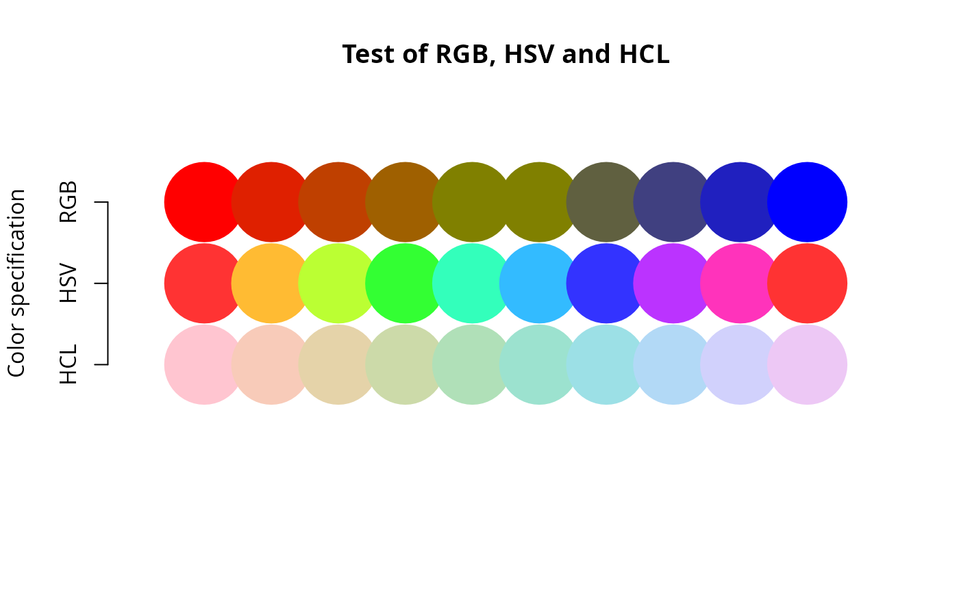 main="Test of RGB, HSV and HCL",xlab="",ylab="Color specification")
