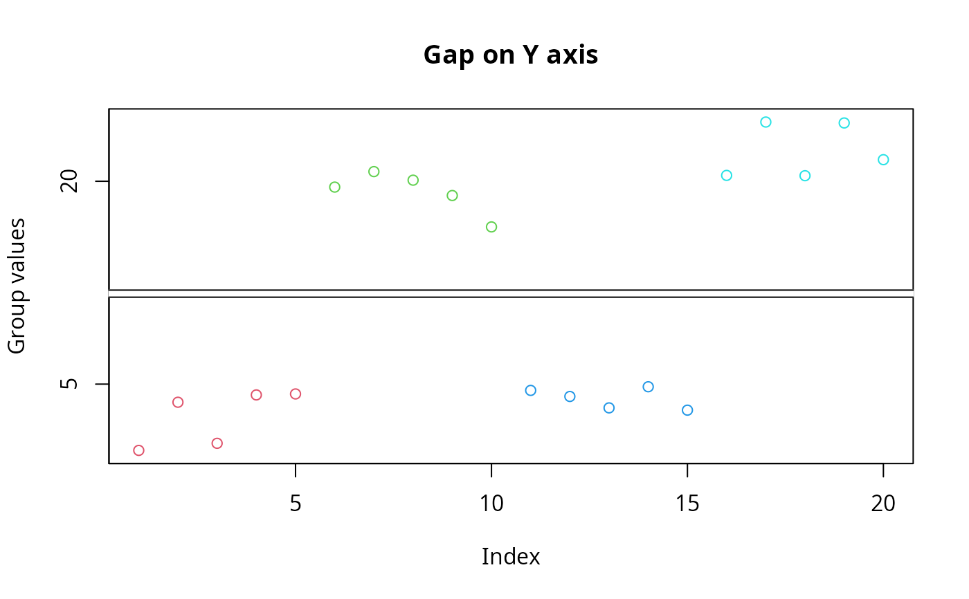 gap.plot(twogrp,gap=c(7,17),xlab="Index",ylab="Group values",