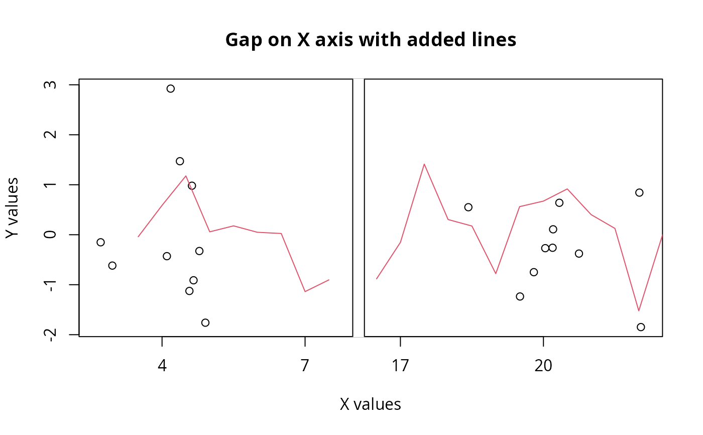 xtics=c(4,7,17,20),ylab="Y values",main="Gap on X axis with added lines")