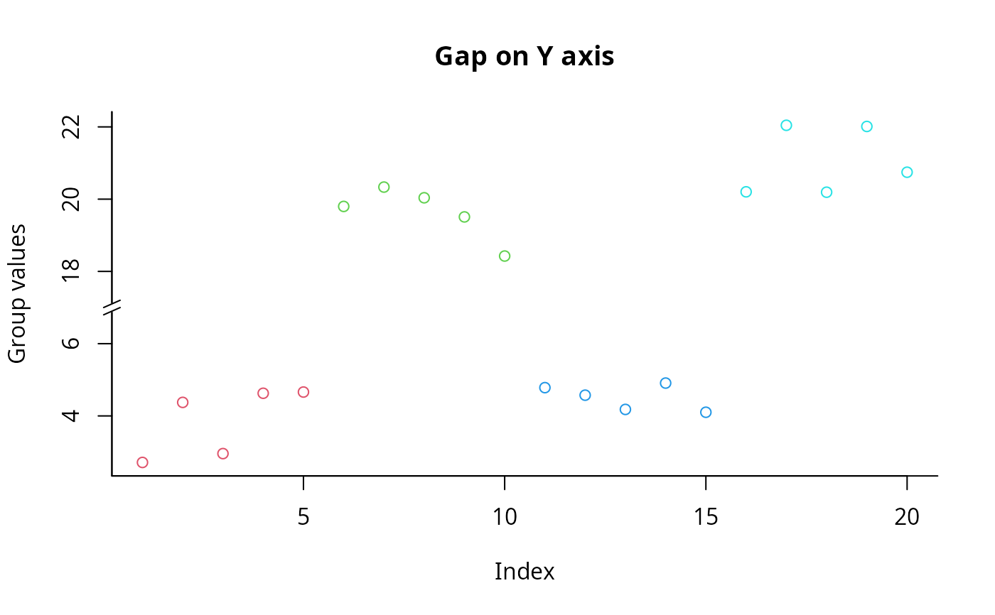 Displays a plot omitting one or two ranges of values on one axis. Typically used when there is a relatively large gap or two in the overall range of one set of values, often because of outliers. The function warns the user if any values may have been omitted by being in the "gap". See axis.break for a brief discussion of plotting on discontinuous coordinates.