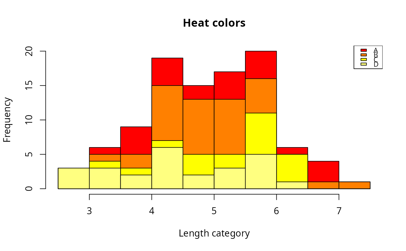 histStack(len~grp,data=df,col="heat.colors",main="Heat colors",