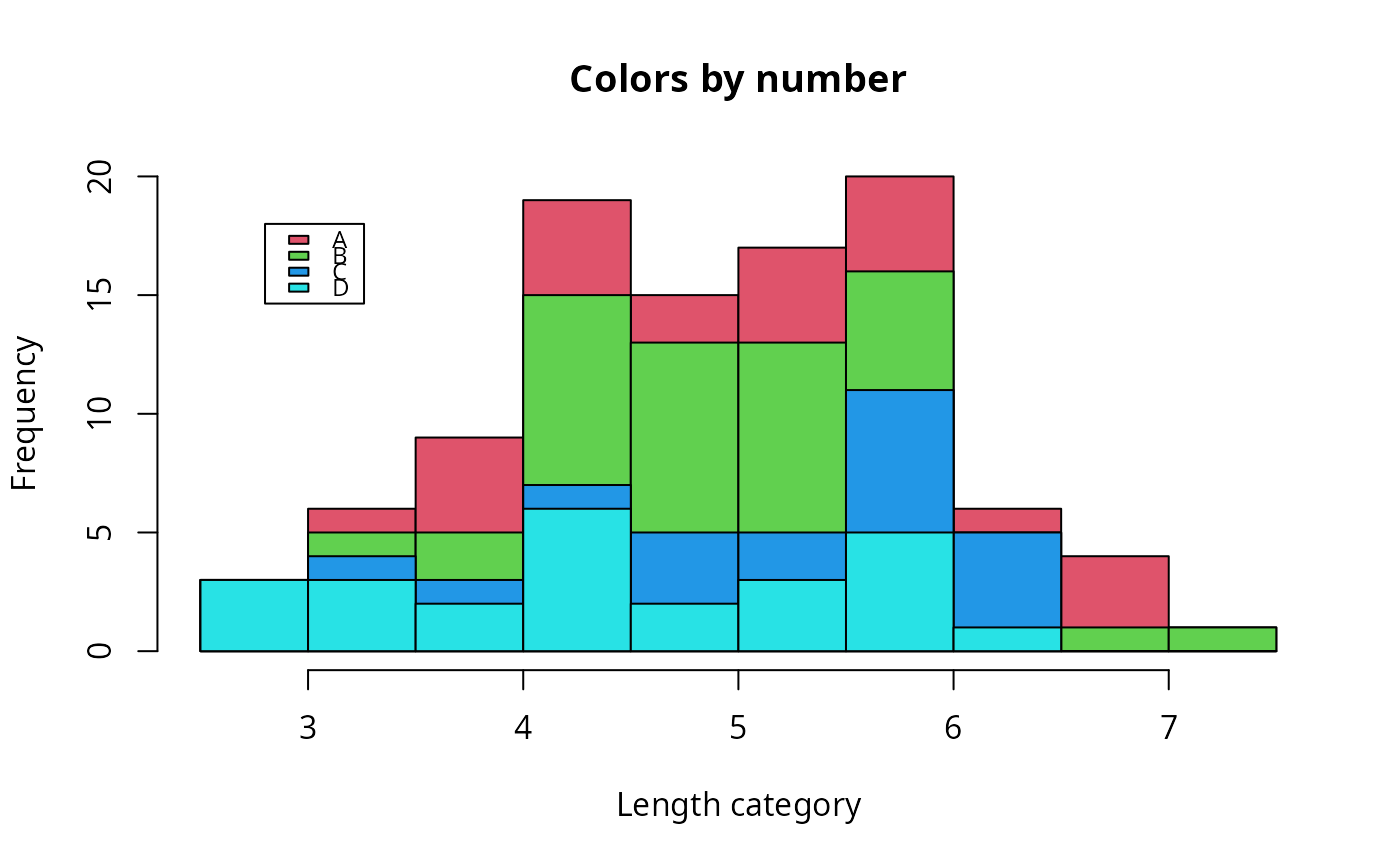 histStack(len~grp,data=df,col=2:5,main="Colors by number",